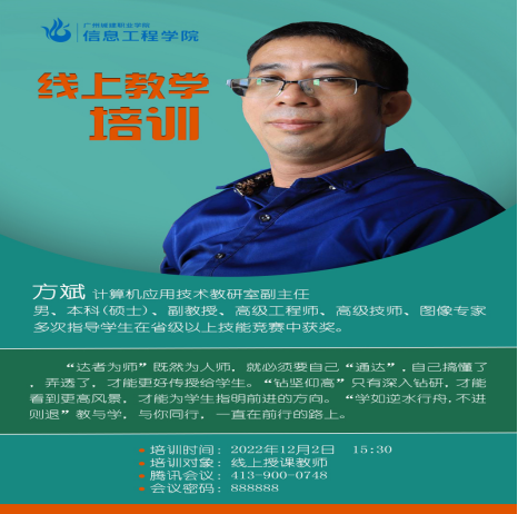 方斌老师从本学期第10周开始,因疫情防控要求居家授课,对线上教学模式具有一定的经验总结和前期探索。他以“风雨共济砥砺前行“作为本次线上教学培训的主题,针对教师使用的线上平台与智慧教学工具,通过面临问题、前期探索、新的问题、方案设计、腾讯会议使用等几个方面进行培训,全方位、多维度提升教师线上教学水平。