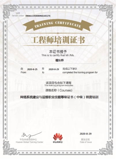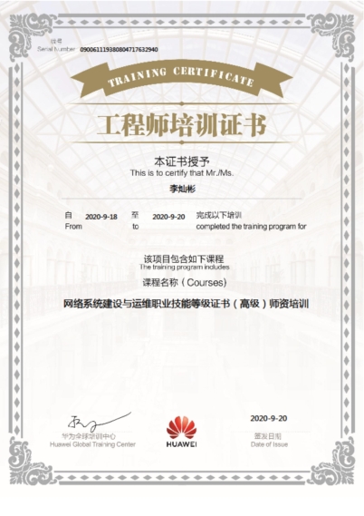 师资团队中,拥有HCNA-Routing&Switch(1人)、 HCIP-Cloud Computing(1人)、 HCIA-Security(1人)、 HCIA-Routing&Switch(1人)、 HCIA-Datacom(2人)、 HCIA-Cloud Computing(2人)、 华为ICT学院讲师HCAI(5人);网络系统建设与运维职业技能等级证书(高级)师资培训(3人)、网络系统建设与运维职业技能等级证书(中级)师资培训(4人)。