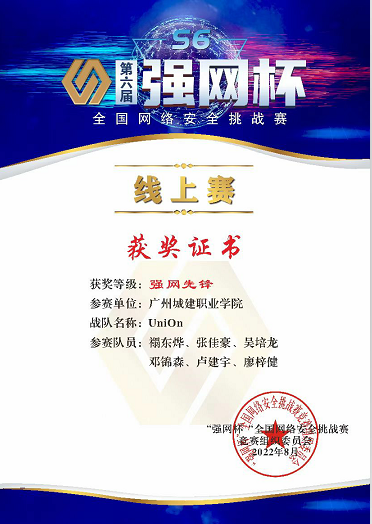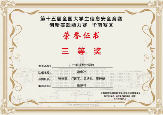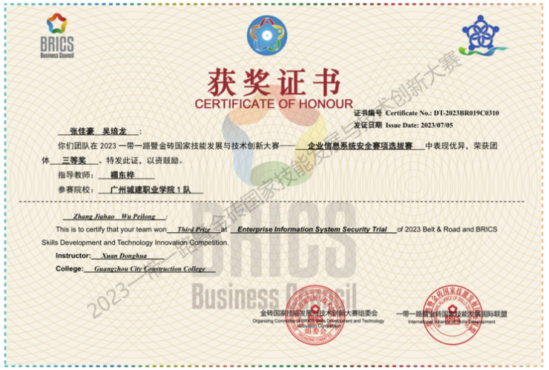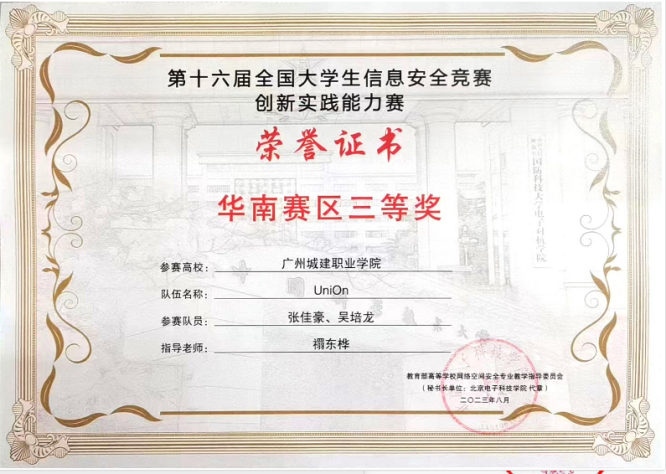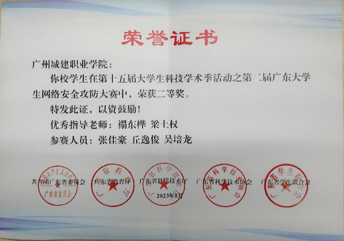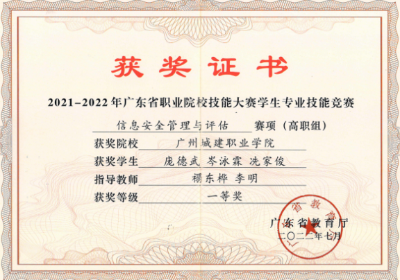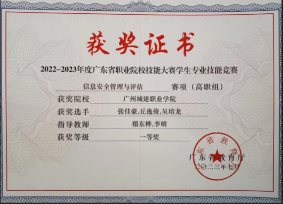 学院师生连续五年荣获广东省职业院校学生专业技能大赛“网络系统管理”赛项一等奖,近五年4次荣获广东省职业院校学生专业技能大赛“信息安全管理与评估”赛项一等奖,获得第十五届全国大学生信息安全竞赛创新实践能力赛华南赛区三等奖、第六届“强网杯”全国网络安全挑战赛-强网先锋、第十六届全国大学生信息安全竞赛创新实践能力赛、2023 一带一路暨金砖国家技能发展与技术创新大赛一一企业信息系统安全赛项选拔赛、华为ICT大赛2023-2024广东省 实践赛-网络赛道高职组中荣获二等奖、华为ICT大赛2023-2024”广东省实践赛-网络赛道高职组中荣获优秀指导教师奖、第十五届大学生科技学术季活动之第二届广东大学生网络安全攻防大赛二等奖等一大批荣誉。