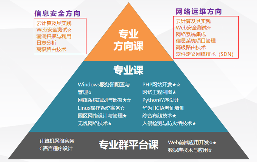 计算网络技术专业旨在培养面向网络综合布线实施、局域网搭建、网络设备安装与调试、网络系统维护与管理、网络工程规划、设计和实施、局域网安全管理、服务器安全配置与维护、系统漏洞修复与病毒防御、信息系统安全管理等岗位的技术与管理工作,面向网络系统集成、信息安全领域的高素质技术技能人才。