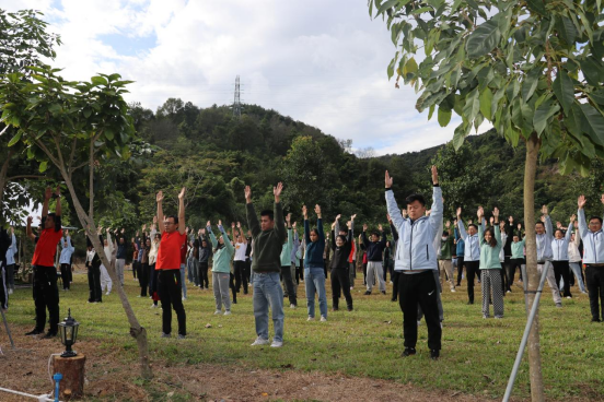 登山前,队伍抵达了风景如画的水果迷城草坪。在这里,大家排成整齐的队伍,集体开始进行团队热身、八段锦训练,摄影师捕捉下了这一难忘的瞬间。合影中,每位教职工的脸上都朝气蓬勃,展现出了学院大家庭的和谐与温馨。