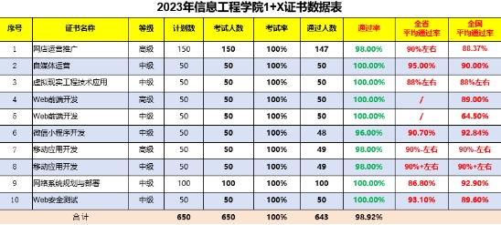 经过严格的申报和审批流程,我院2023年“1+X”试点证书申报计划数为650,获批数为650,应参加考试人数为650,实际考试人数为650,指标完成率高达100%,共有643人顺利通过考试,取得相应证书,证书平均通过率高达98.92%,均高于全省甚至全国的平均水平。