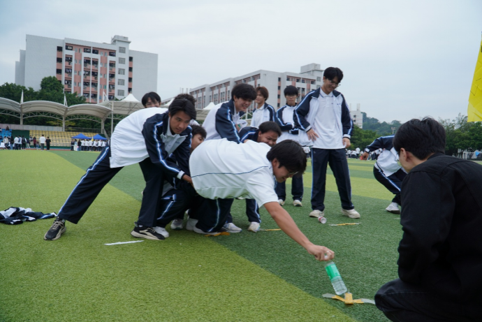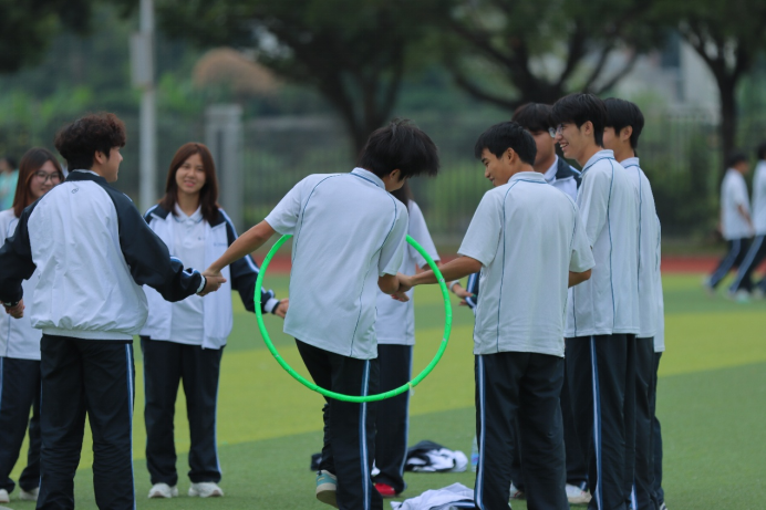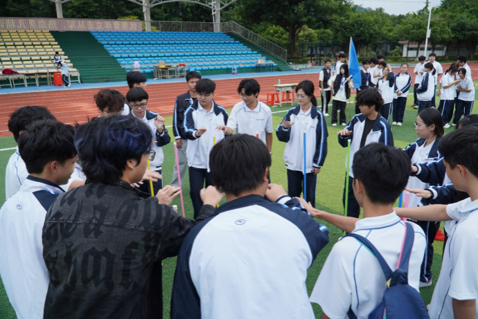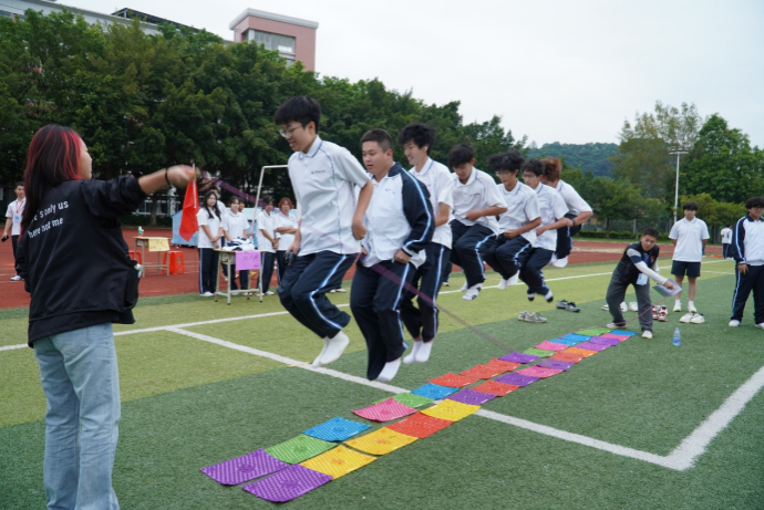 运动会开始后,“十人九足”项目中,队员们肩搭着肩,腿绑着腿,仿佛一个多足巨人在协同迈进;“指压板跳大绳”时,摇绳者与跳绳者完美协作,汗水与欢笑交织,痛苦的触感因团队的共同承担而化为激昂的乐章……素拓项目里,各团队齐心协力,精诚合作,为了共同的目标而奋力拼搏。