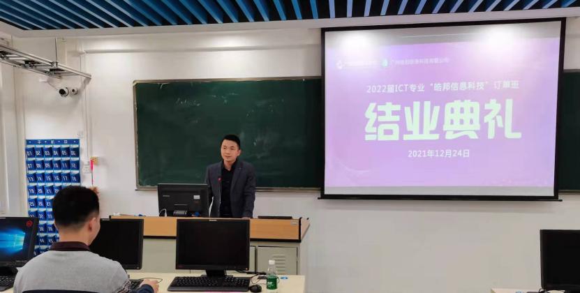 12月24日,广州城建职业学院第一期“皓邦信息科技”订单班结业典礼在信工财经楼2309网络综合实训室举行。皓邦公司总经理纪家辉、技术总监余恒怡、培训讲师谢晓航、项目经理钟道恩及学院院长曹春华出席了结业典礼。典礼由学院副院长汤锋主持。