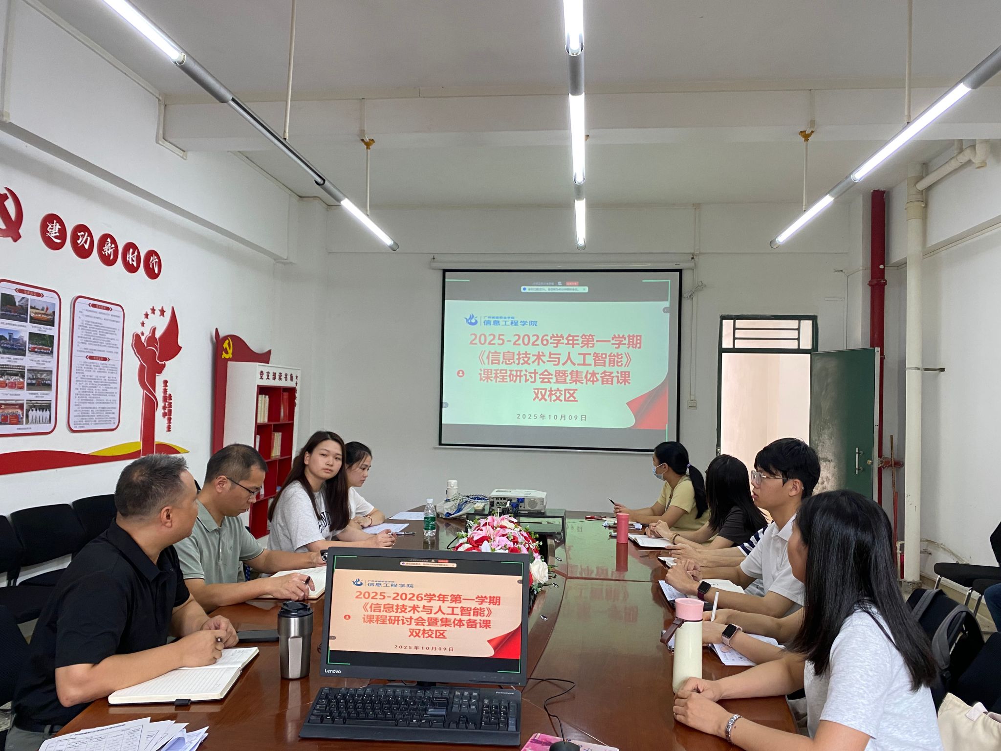 10月9日15:30,《信息技术与人工智能》课程研讨会暨集体备课会在信工财经楼328会议室与腾讯会议平台同步举行。本次会议是学校广州、清远双校区启动4.0改革后的重要教学研讨活动,采用“线下主会场+线上分会场”模式,广州校区教师现场参会,清远校区教师云端联动,学院院长曹春华、副院长刘君,未来技术应用学院副院长郑永芹及全体任课教师共同参会。