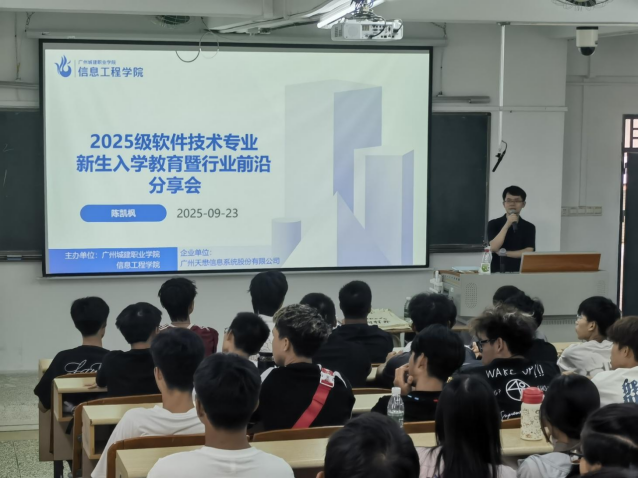 为帮助新生更快熟悉所学专业、精准把握行业发展脉搏、清晰规划职业方向,9月23日,信息工程学院软件教研室经过精心筹备,在信工财经楼成功举办“行业前沿分享会”。本次分享会特别邀请学院合作伙伴——广州天懋信息系统股份有限公司技术总监陈凯枫先生担任主讲嘉宾。陈凯枫凭借深厚的行业积淀与前沿技术视野,为2025级软件技术专业全体新生带来了一场兼具专业性与实用性的技术分享。