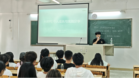 第二个环节为“专业认知教育:我与‘优秀学长’面对面”。邀请到2025届大数据技术专业优秀毕业生邓汉华进行经验分享。目前就职于广州划时代智能科技发展有限公司的他,以“AI时代个人成长与实战分享”为主题,结合自身发展经历,阐述了数据能力在职业发展中的关键作用,将其喻为“打开未来的通用钥匙”。