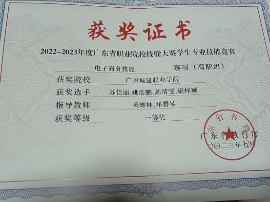 她也深知一场好的直播,脚本是很重要的,它需要创新需要能体现个人的特色,她观看了优秀案例,结合指导老师的意见和自己的想法,写出了自己专属的脚本。在和团队成员相处过程中,她学到了很多不单是专业技能更是在生活的方方面面,最终在团队成员和指导老师的共同努力下,获得广东省职业院校技能大赛电子商务赛项一等奖,她还积极带动身边的朋友一起参加经典朗诵、数字农业培训等各项活动,共同成长、共同进步。
