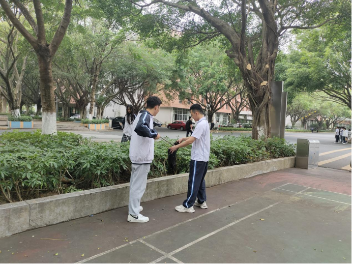 活动现场,党员们佩戴党员徽章,身穿校服,手持清洁工具,清扫校园。党员们齐心协力,大家不怕苦、不怕累、干劲十足。