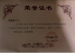 自入学起,便以“知识筑基,实践赋能”为目标,在学业与实践中寻找平衡点。课堂上,他始终保持着前排就坐的习惯,笔记本上密密麻麻的课堂笔记与延伸思考,成为同学们争相传阅的“学习宝典”;课后,他主动拓展专业视野,通过Coursera平台学习云计算认证课程,参与CSDN技术论坛的代码开源项目,逐渐构建起跨学科的知识网络。这份执着让他在两年内连续斩获校级一等奖学金、二等奖学金,更在省级竞技舞台崭露头角——广东省计算机设计大赛中,他带领团队开发的“智慧校园能耗监测系统”,凭借物联网技术与数据分析的创新融合斩获三等奖;在高手云集的广东省职业技能大赛中,他通过模拟企业级网络攻防场景,勇夺二等奖。而鲜红志愿者证书上记录的100余小时服务时长,则见证了他另一面的成长轨迹:从图书馆书籍整理员到社区“银发数字课堂”讲师,他用专业知识帮助老人跨越“数字鸿沟”,在奉献中深化了对技术向善的理解。参与各类竞赛:主动参与学院开展的各种专业竞赛,在竞赛中不断提高自身专业知识的运用能力。获得2024年度广东省计算机设计大赛三等奖,2024年度广东省羊城杯优胜奖,2024-2025年度广东省职业技能大赛二等奖等。