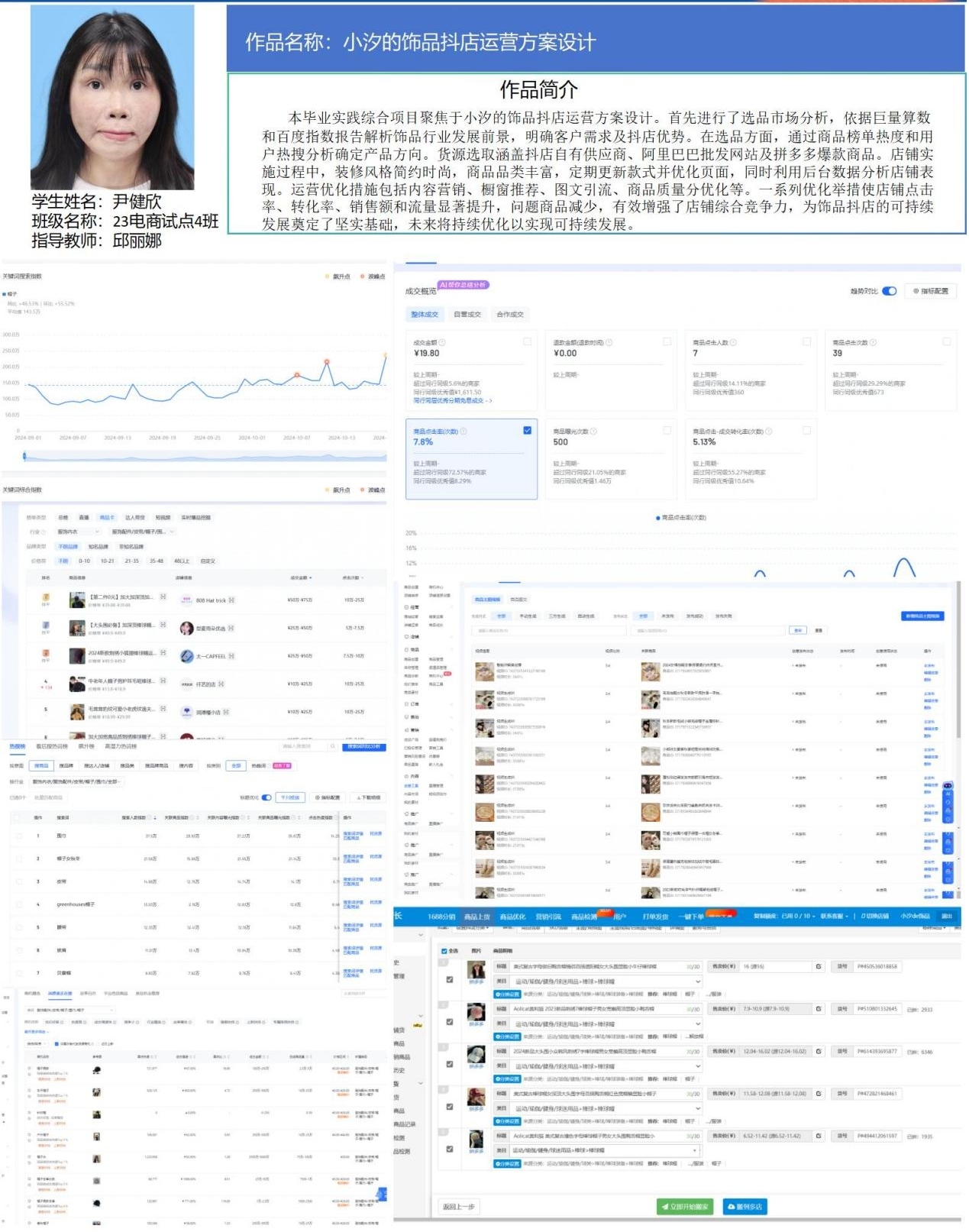 在邱丽娜老师的指导下,23级试点3班张洋洁同学的《泱泱精选小店抖店运营方案设计》毕业实践综合项目聚焦玩具行业抖音运营,通过巨量算数、百度指数等数据分析,结合实际运营验证策略,实现了抖店的流量提升和转化率提高。23级试点4班尹健欣同学的《小汐饰品抖店运营方案设计》定位年轻消费群体对时尚饰品的需求,项目设计涵盖市场分析、选品策略、供应链优化及运营全流程。这两个项目荣获校级优秀综合实践项目。