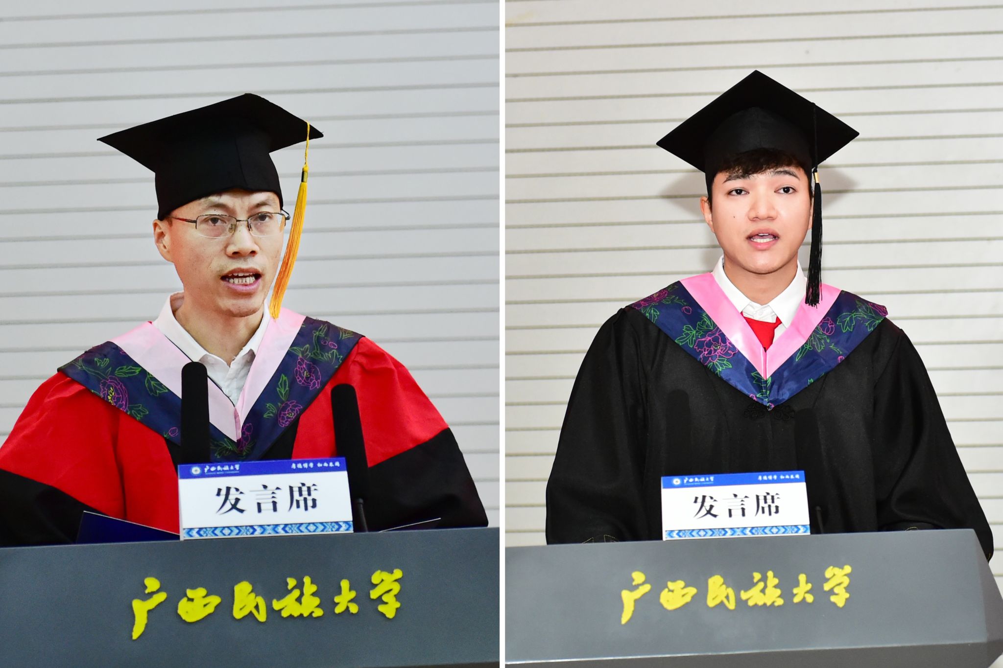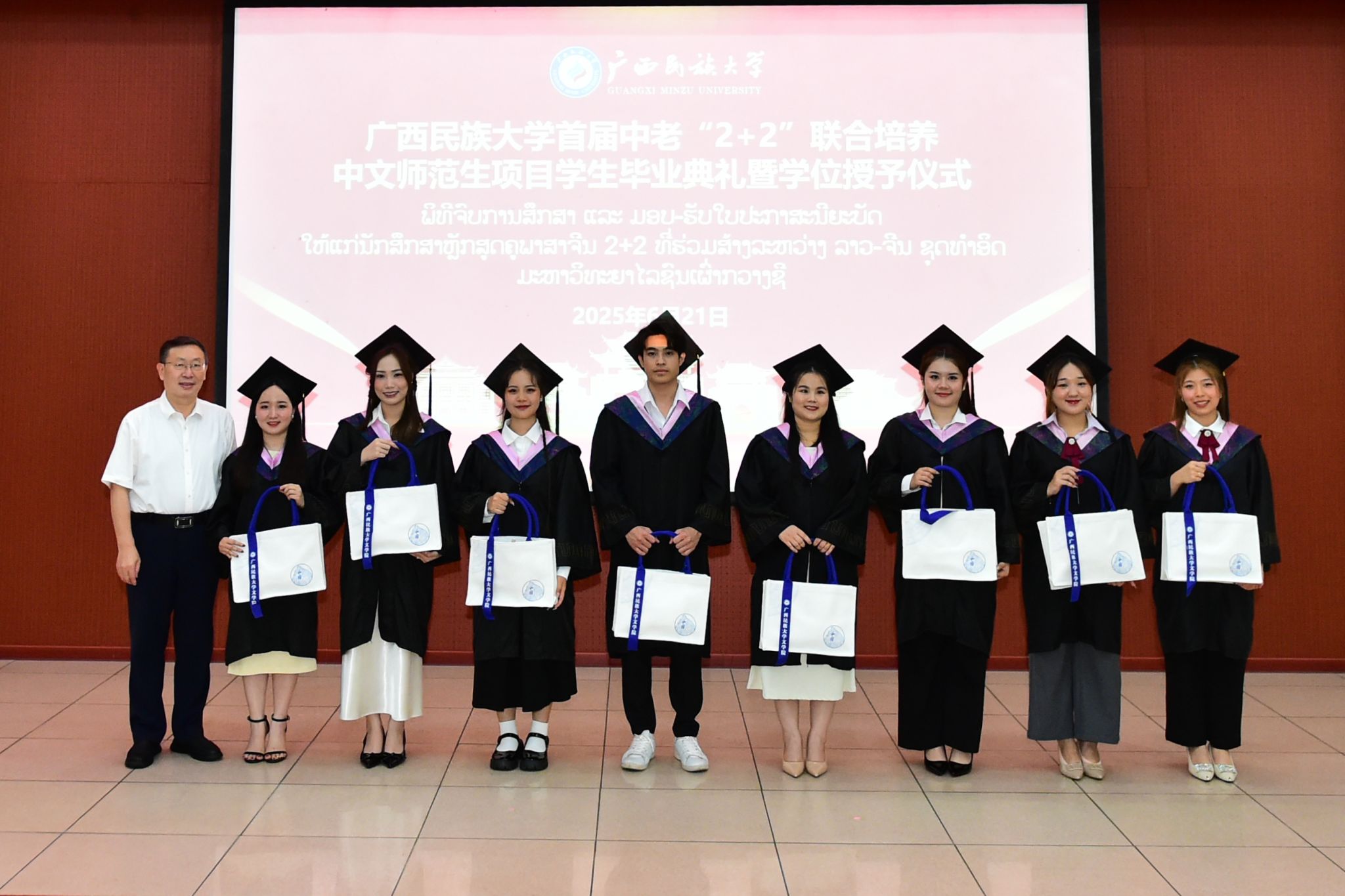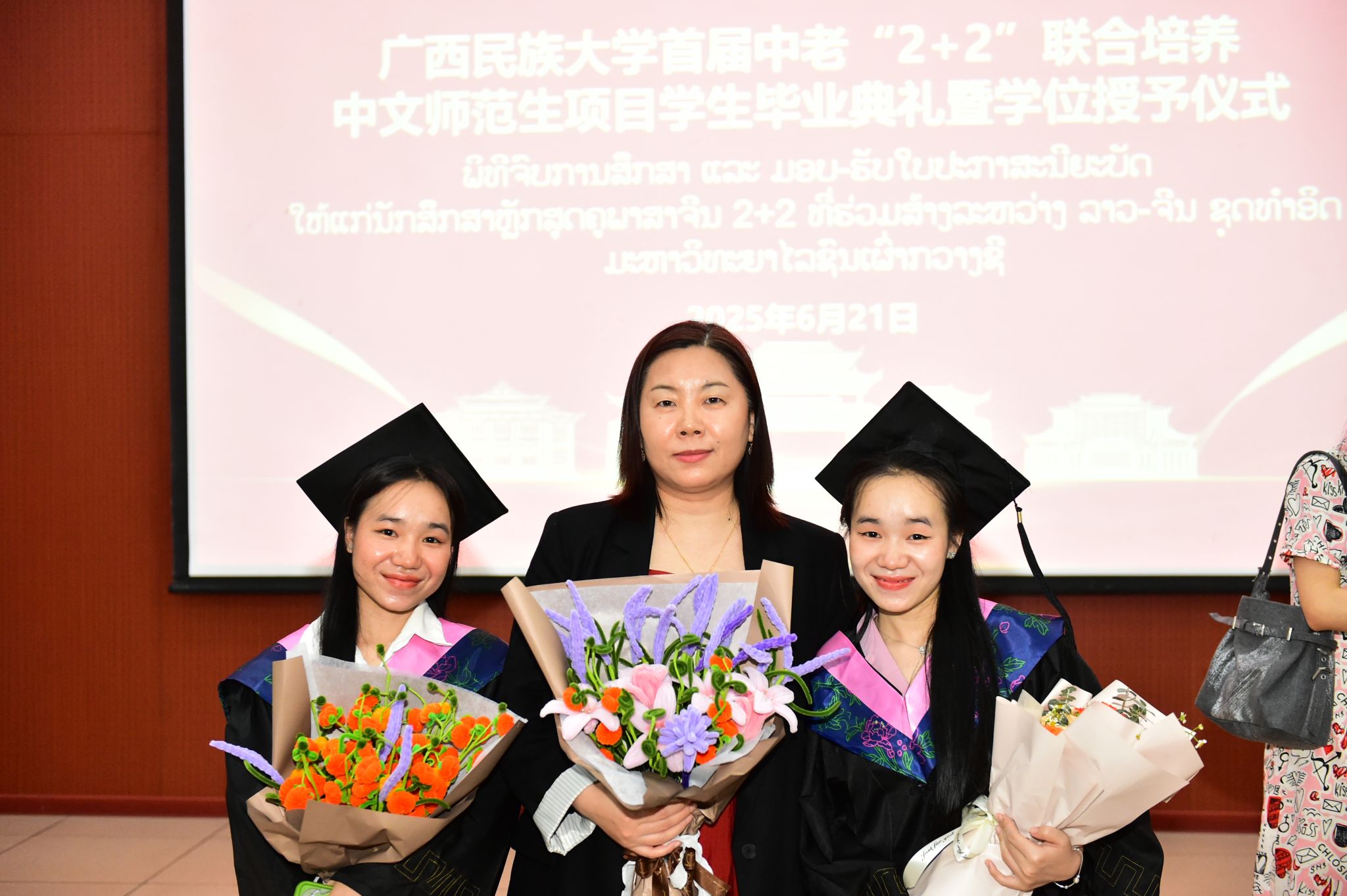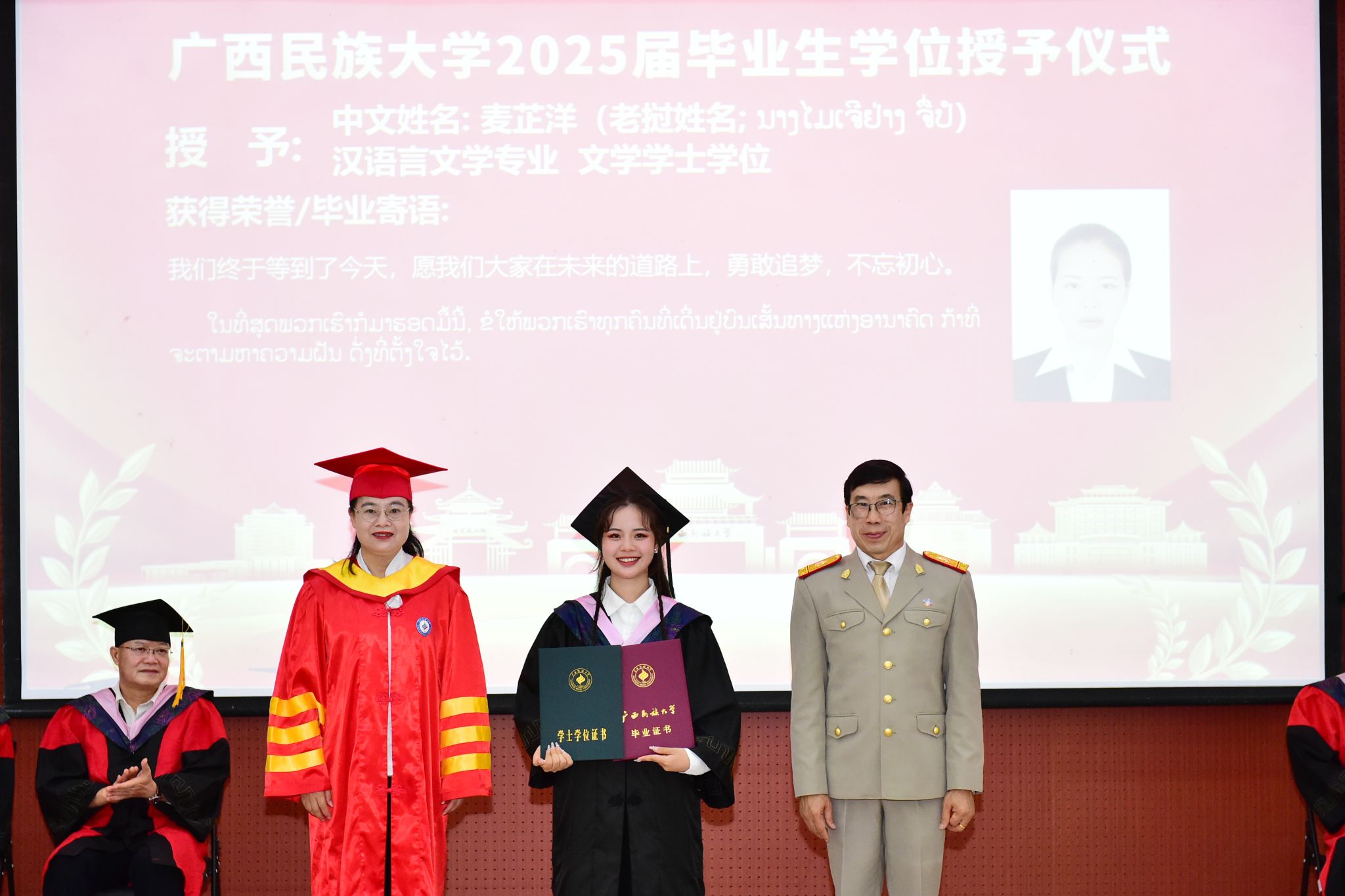 老挝国立大学校长德萨努拉·森登德为毕业生颁发毕业证;广西民族大学校长韦仕珍为毕业生颁发学位证,执拨穗礼并合影留念。
