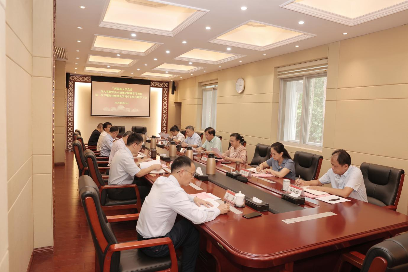 6月25日,广西民族大学党委举行深入贯彻中央八项规定精神学习教育第二次专题研讨暨理论学习中心组专题学习会,校党委书记唐平秋主持会议并讲话。