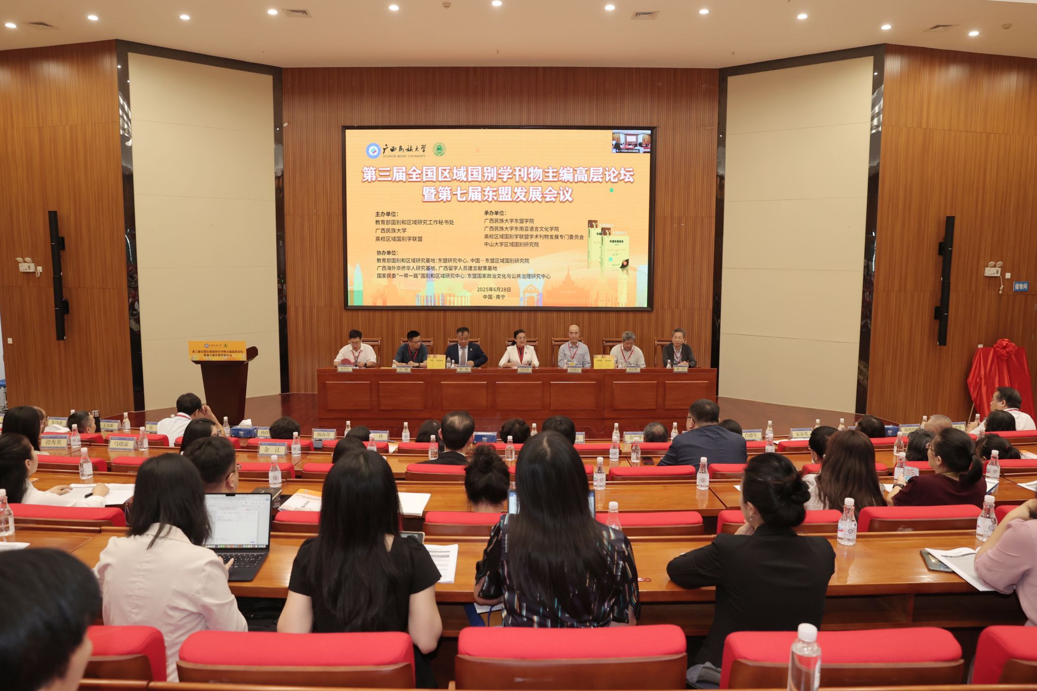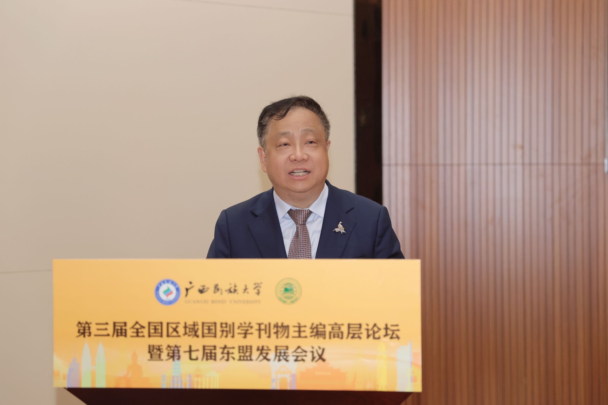 【大学生通讯社报道】6月28日,第三届全国区域国别学刊物主编高层论坛暨第七届东盟发展会议在广西民族大学思源湖校区图书馆报告厅举行。广西民族大学校长韦仕珍,教育部国别和区域研究工作秘书处主任、高校区域国别学联盟学术委员会主席罗林出席会议并致辞。高校区域国别学联盟秘书长、中山大学区域国别研究院院长陈杰,天津商业大学副校长余江,上海社会科学院《史林》主编、历史研究所所长郭长刚,上海社会科学院《国际关系研究》主编、国际问题研究所所长王健,《南洋问题研究》主编、厦门大学国际关系学院/南洋问题研究院教授、广西民族大学“八桂学者”庄国土以及国内高等院校和科研机构专家学者参加会议。广西民族大学副校长高兴宇主持开幕式。
