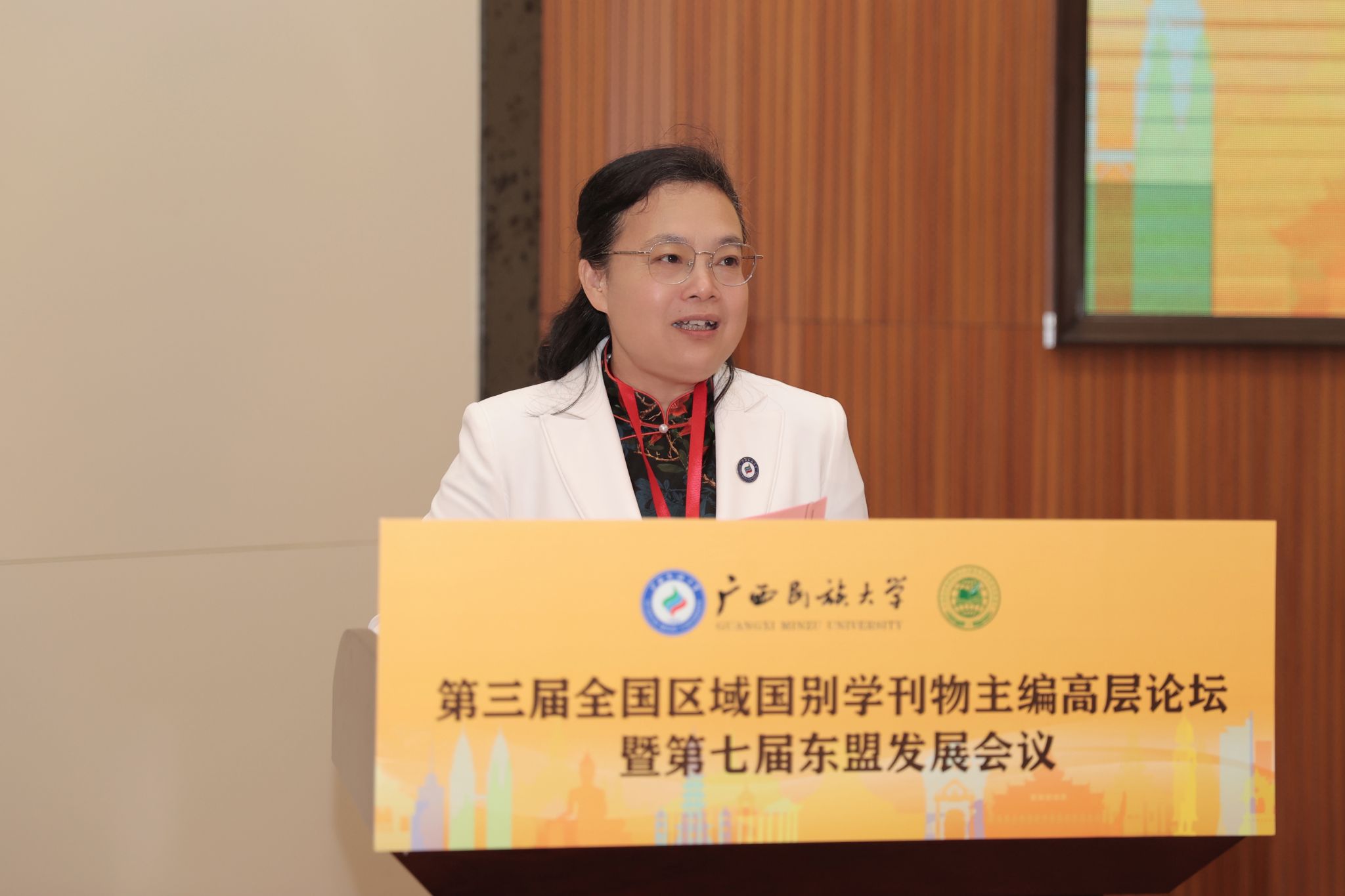 韦仕珍介绍学校在面向东盟的专业与学科群建设、科学研究、人才培养及社会服务等方面取得的成绩。她表示,区域国别学作为一门新兴交叉学科,正呈现出无限生机与活力,学科建设被相关高校纳入重要议程,学科理论呈现百花齐放、百家争鸣的喜人景象,目前学科建设正处于规范化建设的关键时期。期待与会的区域国别研究期刊为区域国别学学科的规范化建设和中国区域国别学自主知识体系建构贡献智慧和力量。