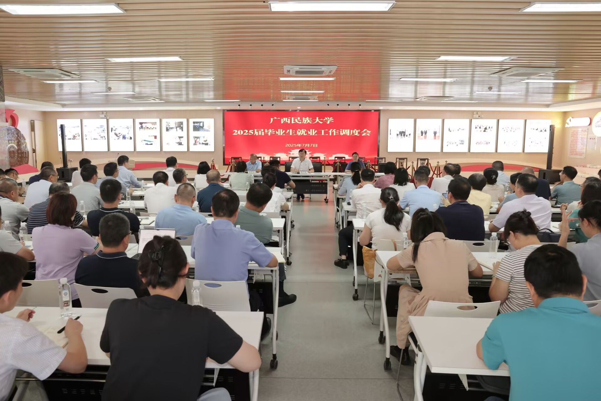 【大学生通讯社报道】7月7日下午,广西民族大学在相思湖校区新时代“我与祖国共成长”党团主题活动文明实践所召开2025届毕业生就业工作调度会。校党委书记唐平秋,校长韦仕珍出席会议并讲话,副校长姜明国主持会议。有关职能部门负责人、各学院负责毕业生就业工作分管领导、辅导员等参加会议。