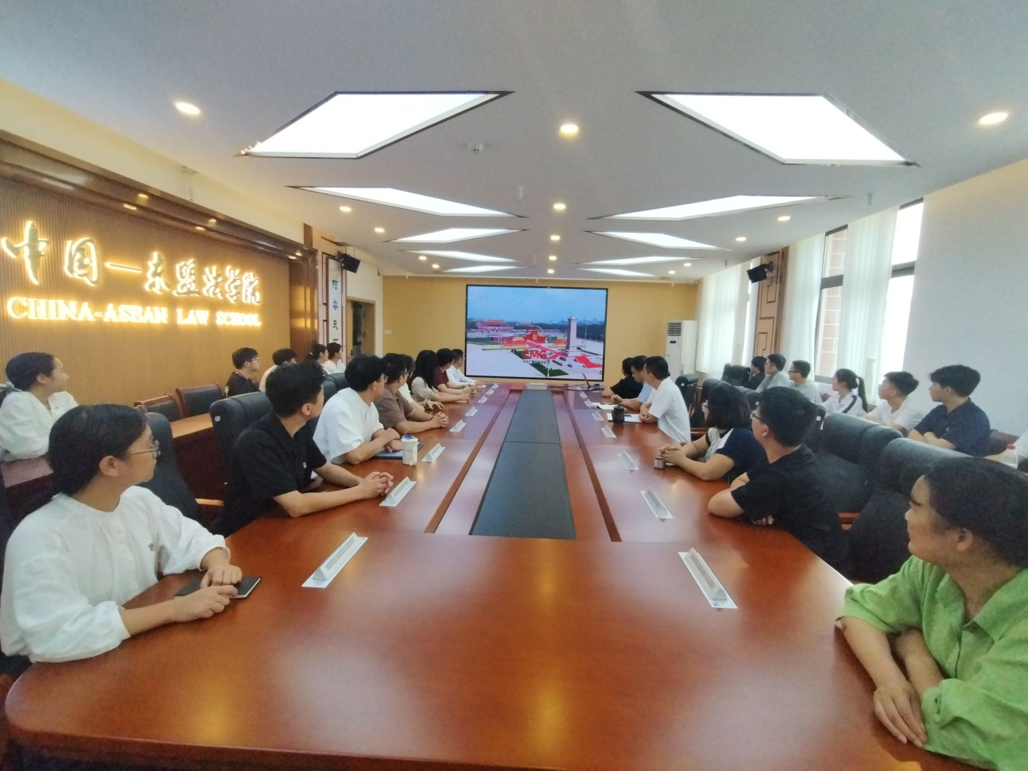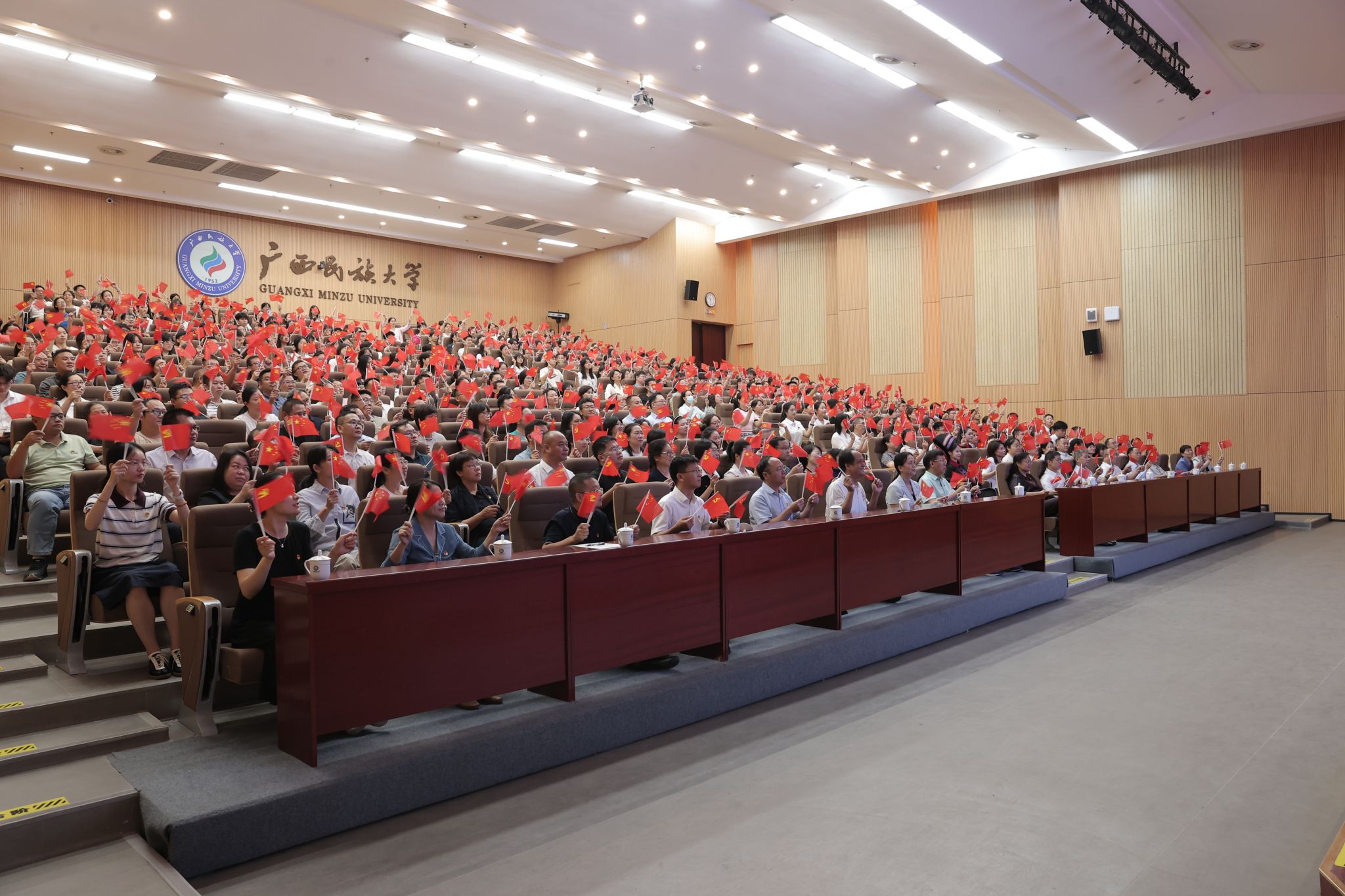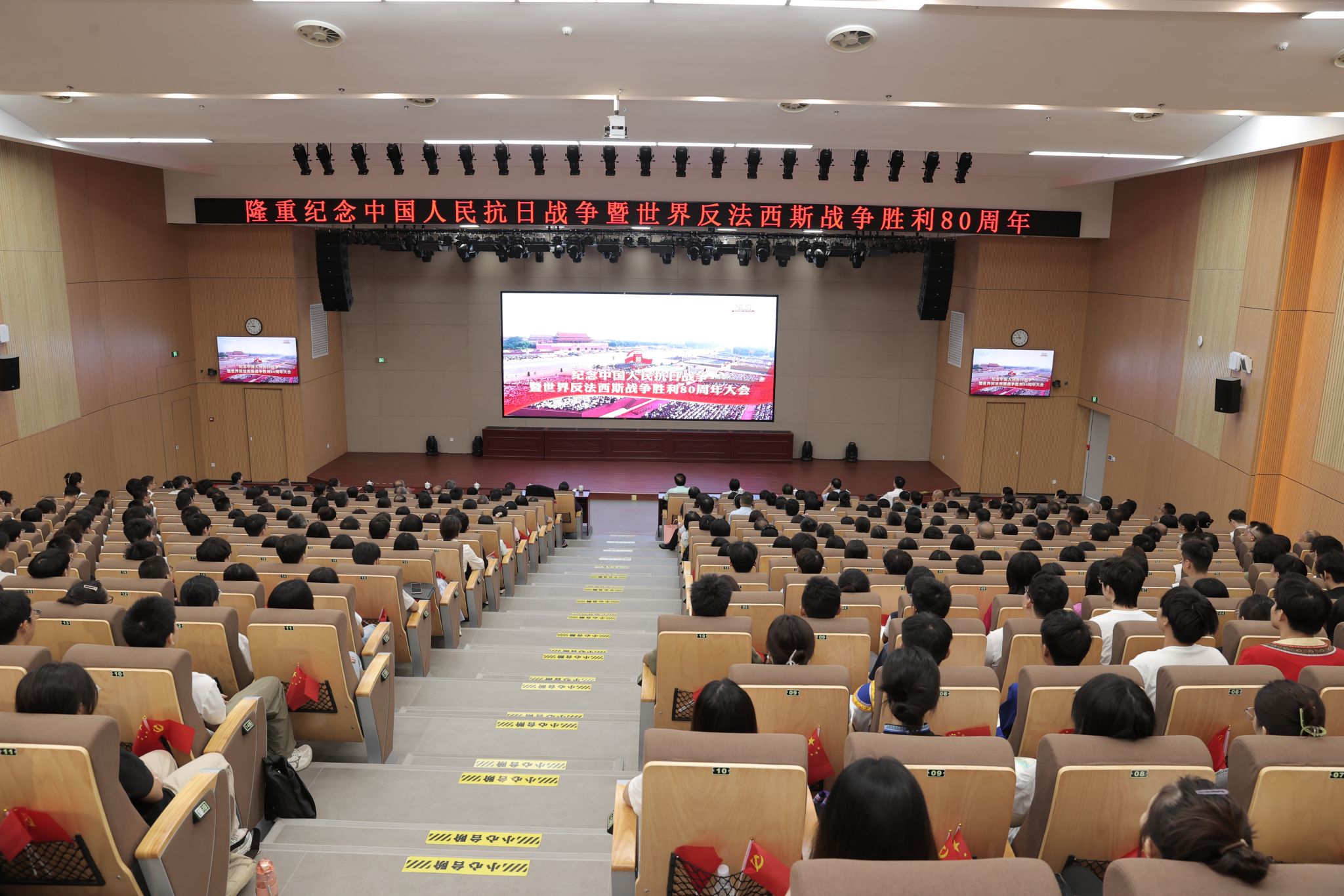 9月3日,纪念中国人民抗日战争暨世界反法西斯战争胜利80周年大会在北京天安门广场隆重举行,中共中央总书记、国家主席、中央军委主席习近平发表重要讲话并检阅受阅部队。广西民族大学师生怀着热切的心情相聚在报告厅、会议室、体育馆等地,以各种形式积极收看大会直播,认真学习习近平总书记重要讲话精神。