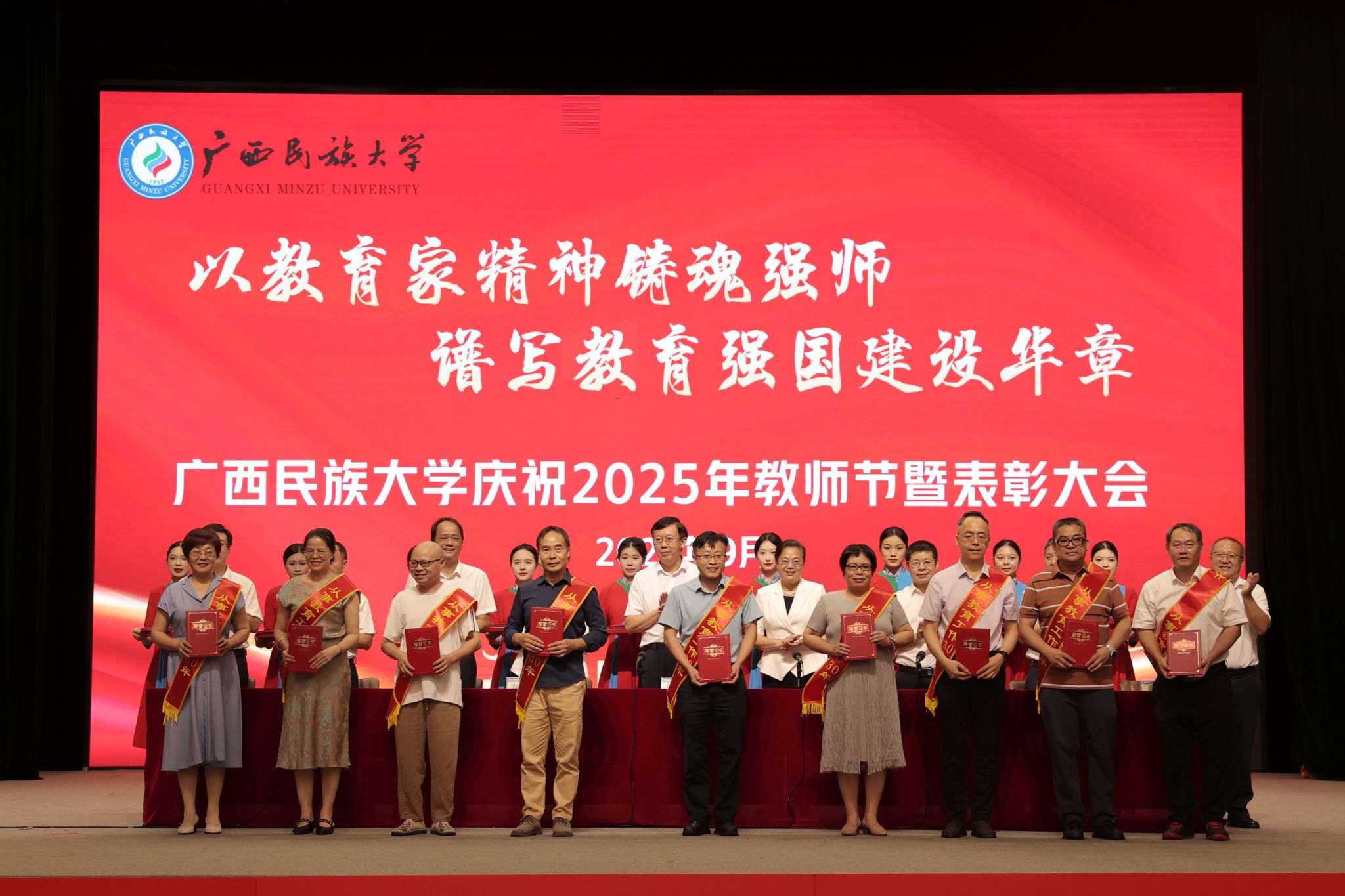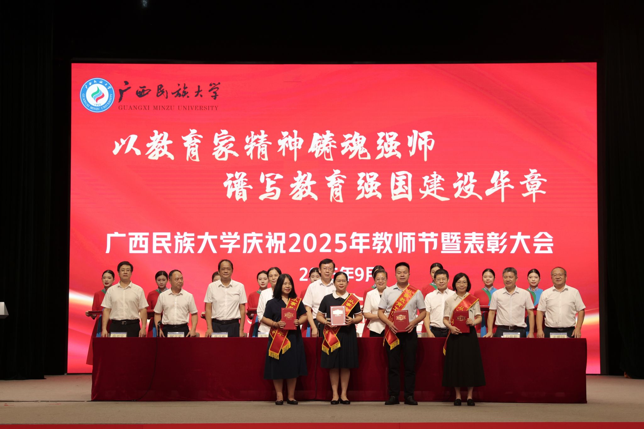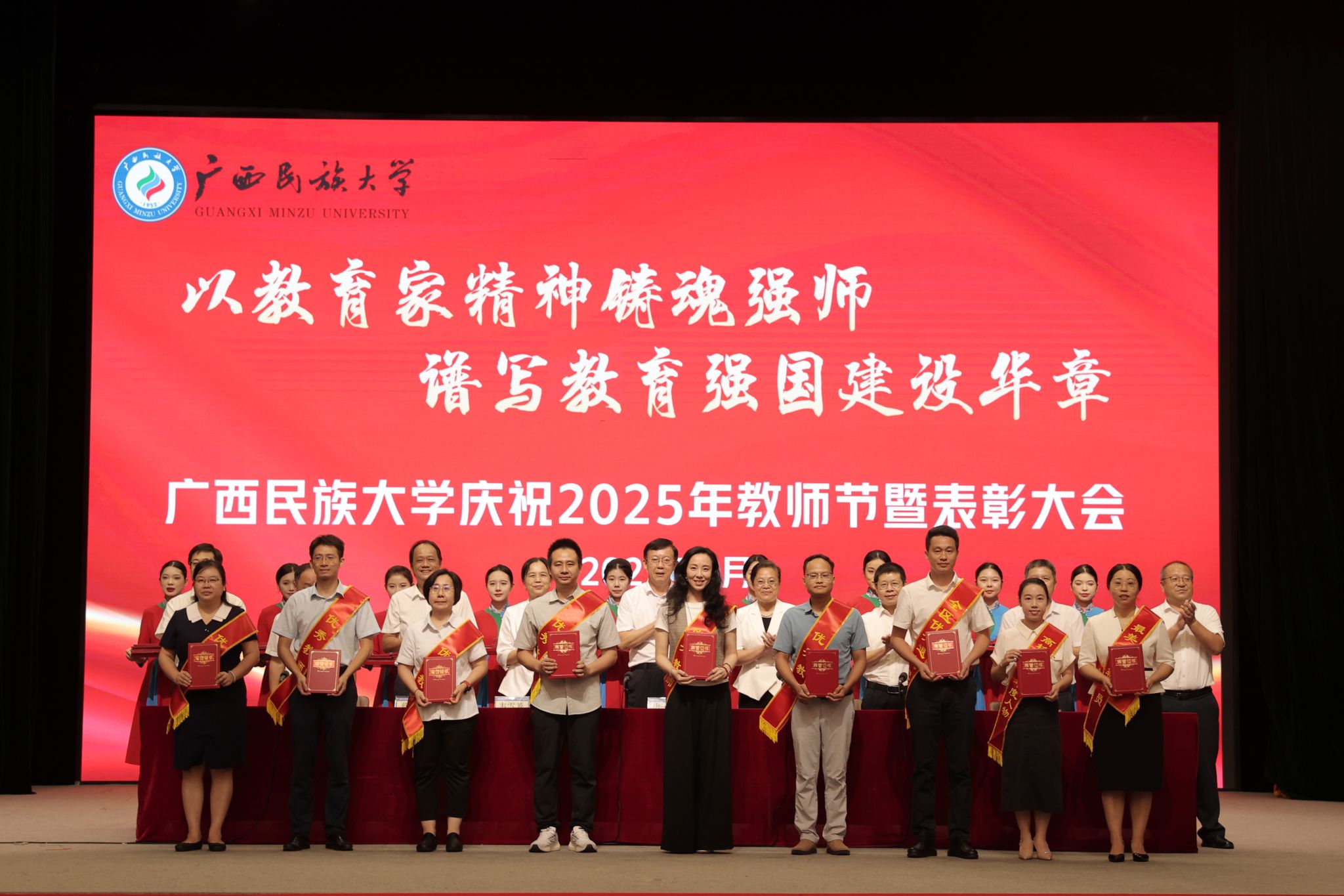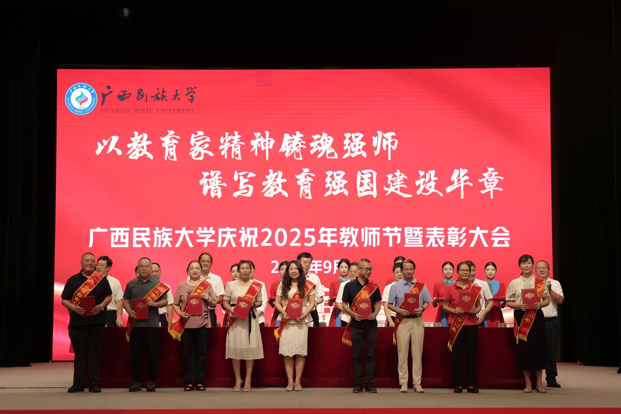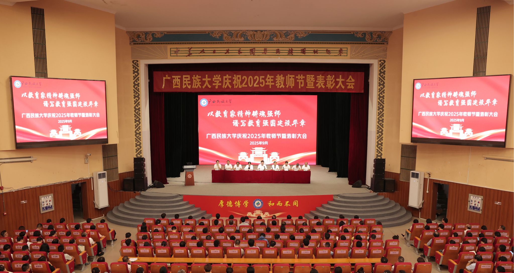【大学生通讯社报道】9月9日下午,广西民族大学庆祝2025年教师节暨表彰大会在相思湖校区大礼堂召开。校党委书记唐平秋,校长韦仕珍,校领导韦雪芳、邓国彬、蔡高根、吕俊彪、何立荣、姜明国、高兴宇出席大会,教职工及学生代表参会。副校长何立荣主持大会。
