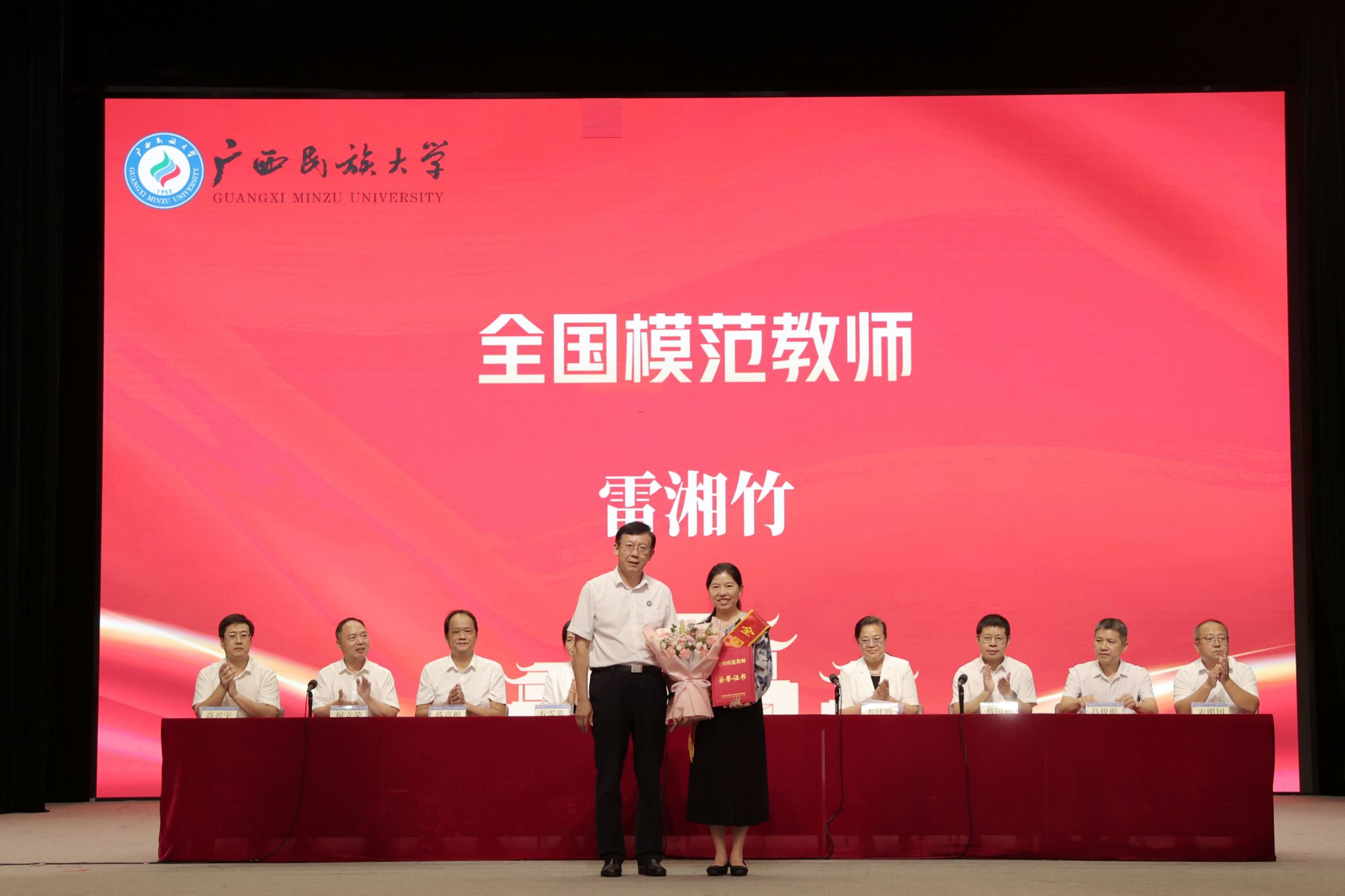 党委书记唐平秋为2024年全国“模范教师”雷湘竹教授颁发荣誉证书,党委副书记、校长韦仕珍为国家级青年人才刘金林教授颁发荣誉证书,校领导为2025年全国高校教师教学创新大赛获奖者、2024年自治区“模范教师”、2024年广西“最美高校辅导员”“高校辅导员年度人物”、2025年“自治区优秀退役军人”,以及学校2023—2025年“模范教师”“优秀教师”“优秀教育工作者”“从事教育工作30年”获奖者代表颁发证书。