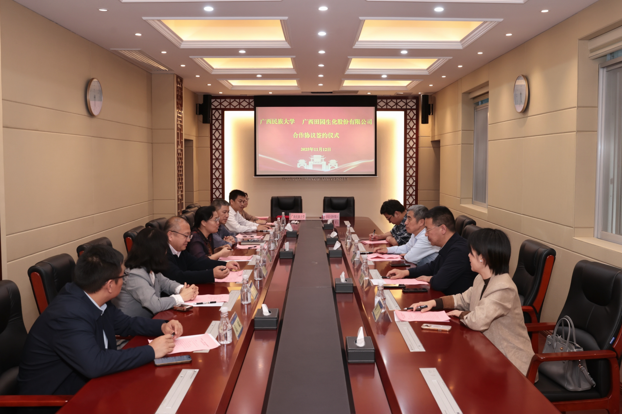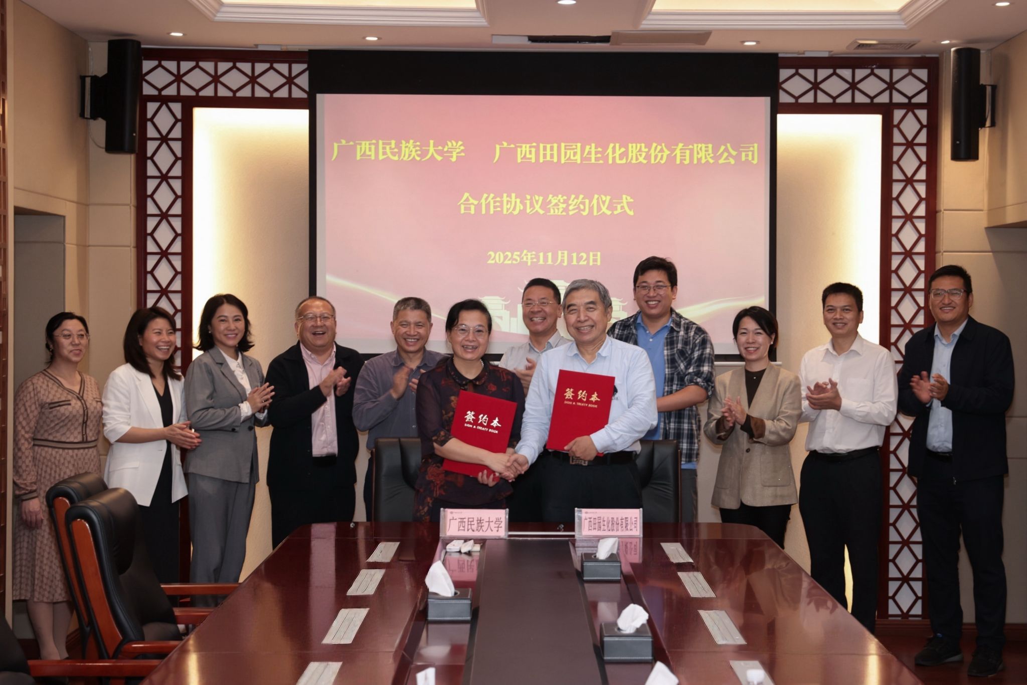 学校党委办公室、校长办公室、人事处、化学化工学院、海洋与生物技术学院、管理学院负责人,与广西田园生化股份有限公司有关负责人共同见证签约。(初审:周丽华 复审:韦利坤 终审:孙寿媚)