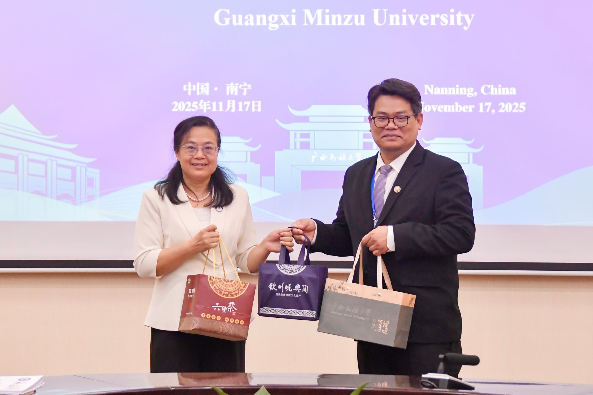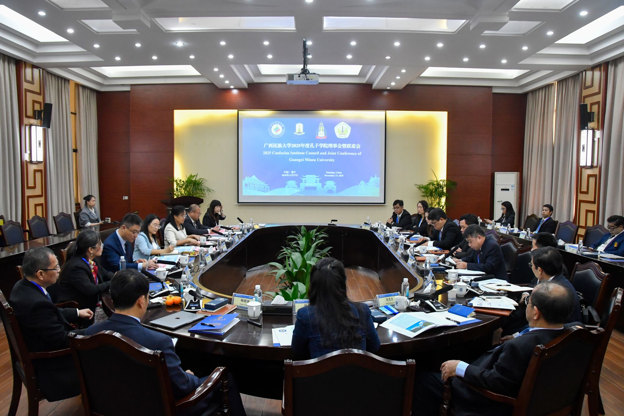 【大学生通讯社报道】11月17日上午,广西民族大学2025年度孔子学院理事会暨联席会在相思湖校区国际合作与交流处大会议室召开。校长韦仕珍出席并致辞,泰国玛哈沙拉坎大学校长巴育·希维莱、老挝国立大学校长德萨努拉·森登德、印度尼西亚丹戎布拉大学校长嘉鲁达·韦科出席会议,副校长姜明国主持会议,孔子学院中方、泰方、老方、印尼方代表、学校有关职能部门负责人与会。