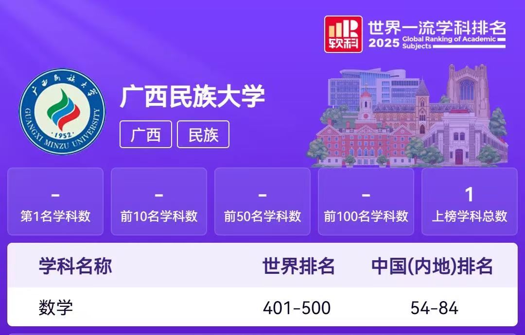 近日,高等教育评价专业机构软科正式发布2025“软科世界一流学科排名”(GRAS)。广西民族大学数学学科表现优异,首次上榜即位列全球第429位,在广西所有高校的数学学科中排名第一,跻身全球前500强。这一里程碑式的成就,标志着学校数学学科建设水平和国际学术影响力迈上了新台阶。