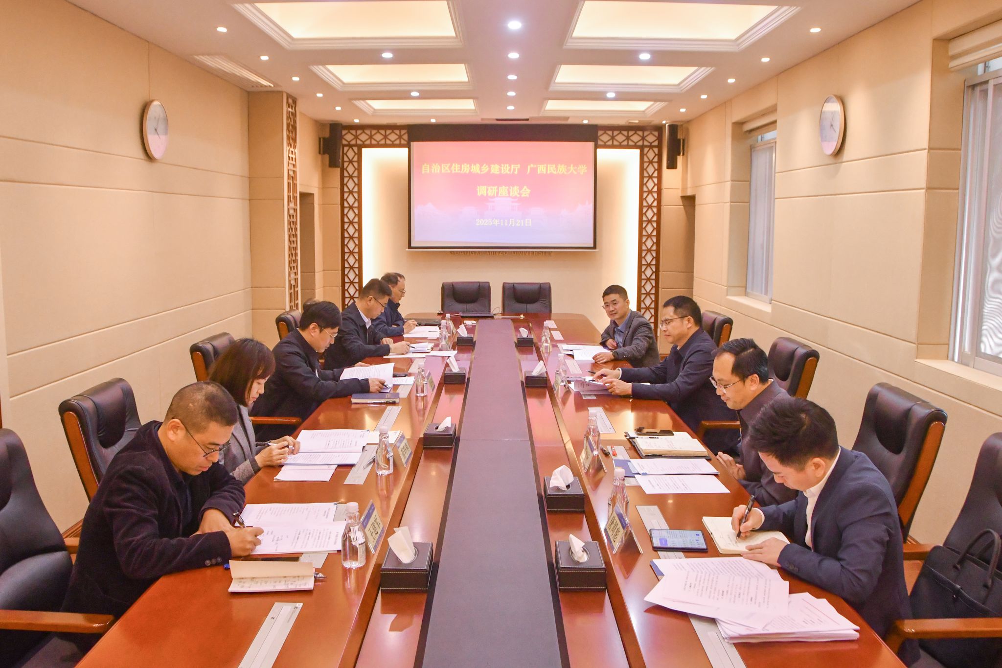 11月21日,校党委常委、副校长高兴宇与到广西民族大学调研的自治区住房城乡建设厅调研组一行进行座谈,双方希望以共同推进“AI赋能千行百业超级联赛——智慧城市建设创新应用大赛”为纽带,加强校企协同与东盟联动,为推动区域高质量发展开展密切合作。(初审/罗明 图/文/韦静宇 编/梁晶晶 实习编辑:梁火琼 杨诗琦 复审/韦利坤 终审/孙寿媚)