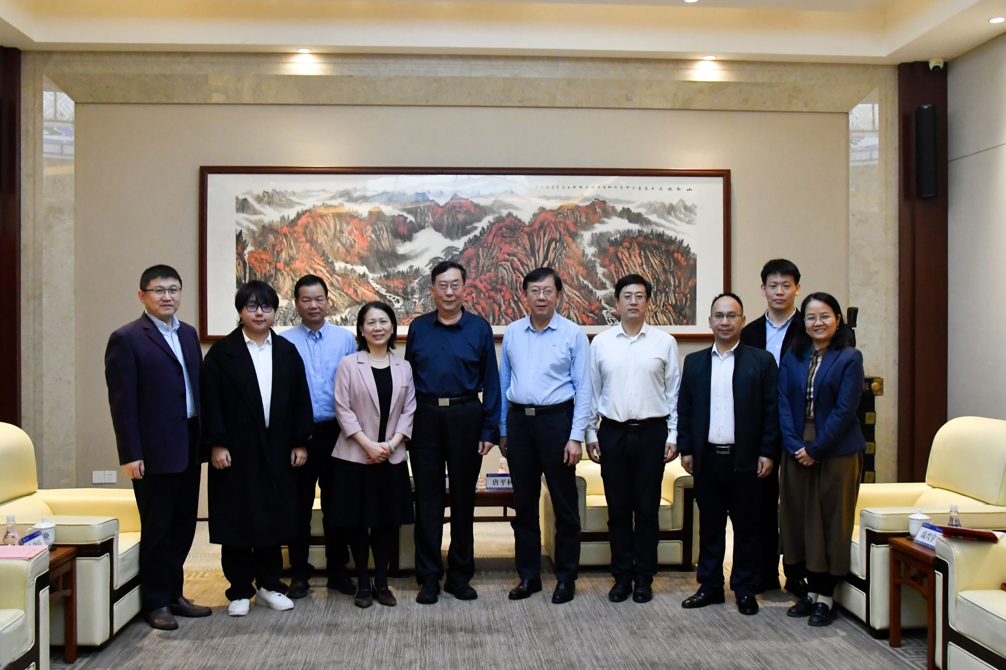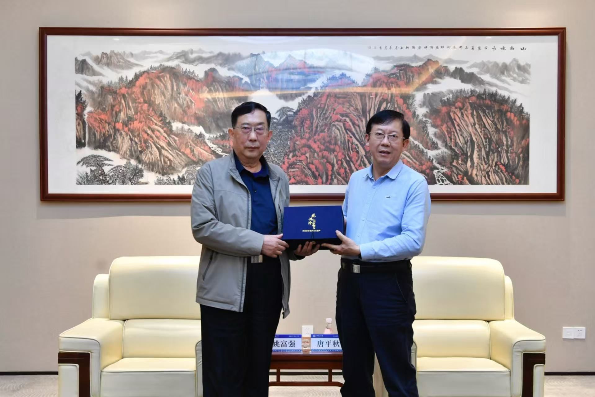 会后,唐平秋向姚富强赠送纪念品,与会双方合影留念。(初审:罗丽平 复审:韦利坤 终审:孙寿媚)