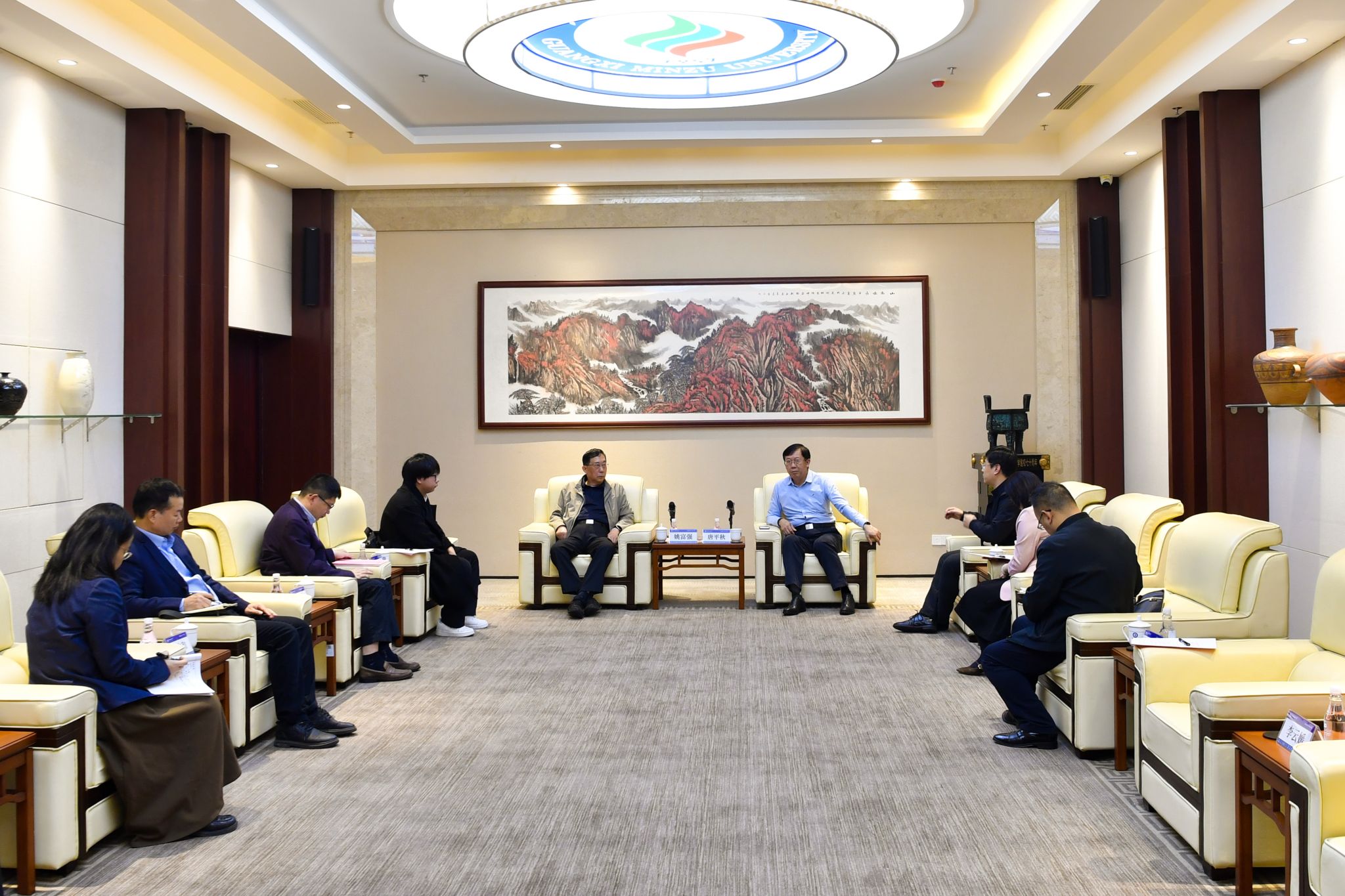 唐平秋对姚富强的到来表示热烈欢迎,他指出,广西民族大学始终积极响应服务国家战略与广西构建现代化产业体系的需求,立足学校办学定位,在全面发展的基础上重点聚焦新工科建设;深入推进不同学科交叉融合,以数字化赋能中国少数民族语言语料库、东南亚非通用语言语料库与法律大模型建设,努力推动科技成果转化与科研成果落地;与东盟多国高校、企业建立合作关系,推动形成“人工智能+”应用合作项目,在积极打造“北上广研发+广西集成+东盟应用”的人工智能发展路径中发挥区位优势、展现民大特色。他希望姚富强院士对学校建设发展提出宝贵建议,在学科内涵式建设与发展方向等方面提供进一步指导。