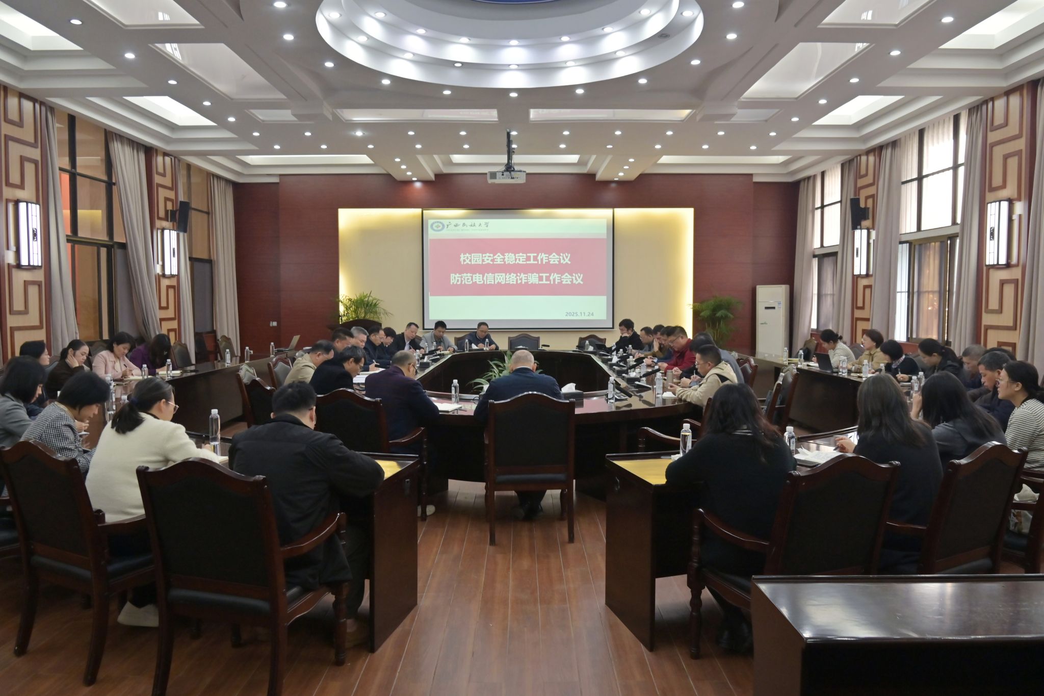 11月24日,校党委副书记陈铭彬在校园安全稳定工作会议及防范电信网络诈骗工作会议上强调,各单位要将工作部署落到实处,拧紧责任链条,加强政策宣传,做好风险管控,推进协同共治,加强师生安全教育引导,构建防范电信网络诈骗工作常态化机制,切实提升校园安全治理工作成效,筑牢校园安全防线。(初审/刘兵 图文/卢思然 编/李杨洁 复审/韦利坤 终审/孙寿媚)