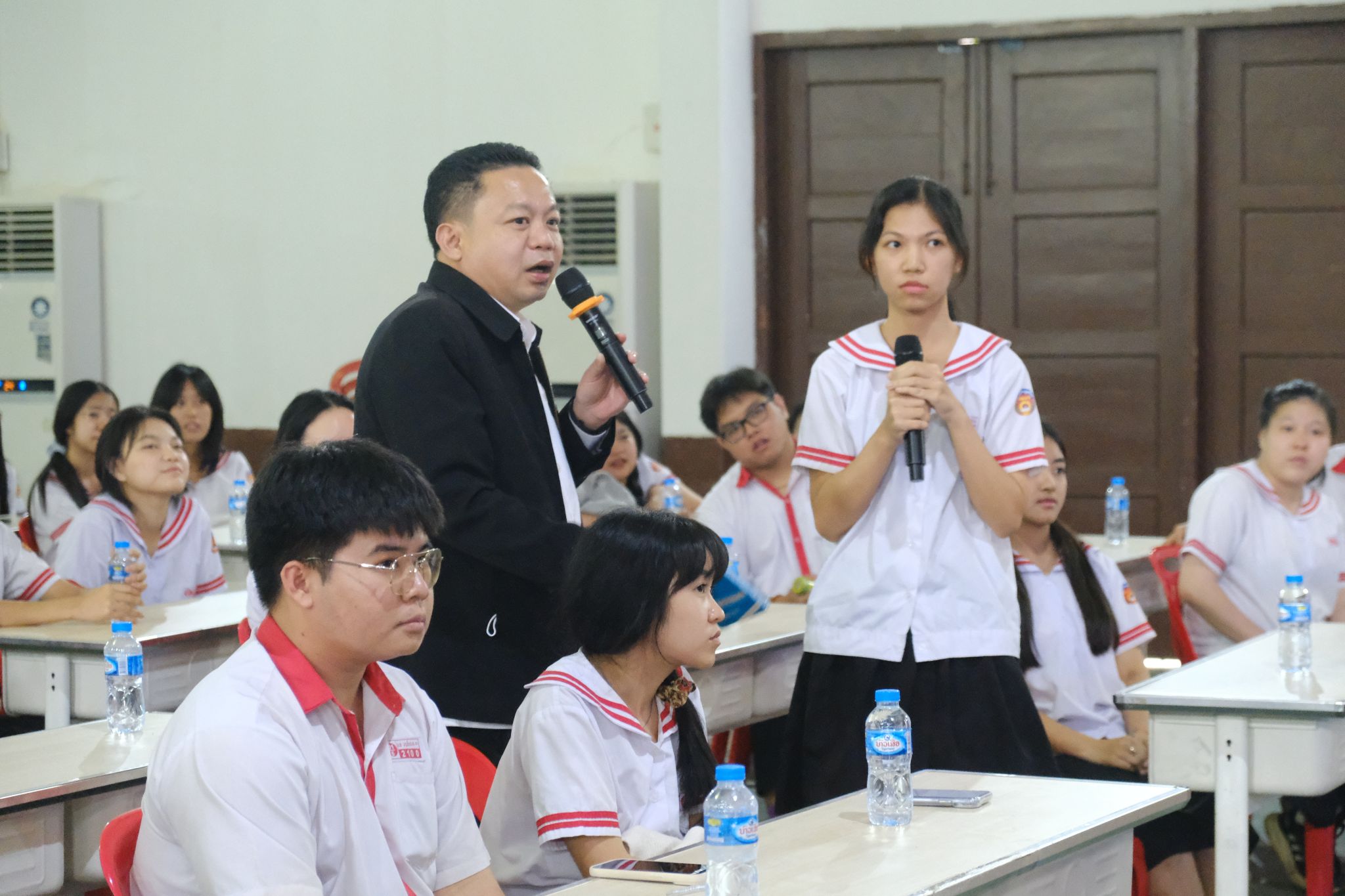 老挝国立大学孔子学院领导介绍孔子学院的发展历史和办学特色、中文师范本科专业在培养模式和师资力量方面的办学优势,寮都公学往年毕业学子在孔子学院和中国广西民族大学的优异表现,并在现场为同学们答疑解惑,向同学们发出报考邀请。