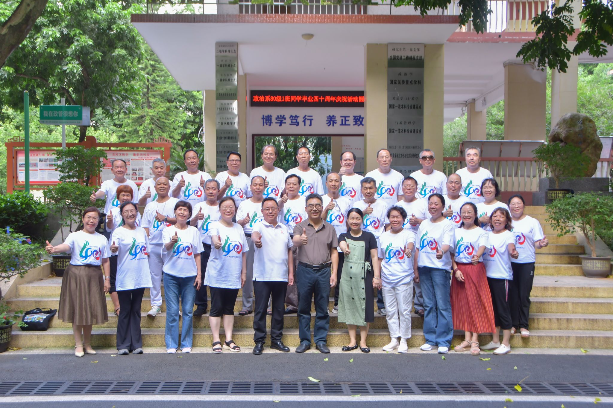 何立荣表示,学校牢牢把握社会主义办学方向,扎根八桂大地办教育,累计为国家输送了35万余名民族干部和专业人才。政治系作为我校最早成立的三大系之一,在党建引领、人才培养和教学科研方面都取得了出色成绩,希望各位校友能够充分利用自身资源和优势,与学校保持紧密联系,关注母校发展,支持母校建设。