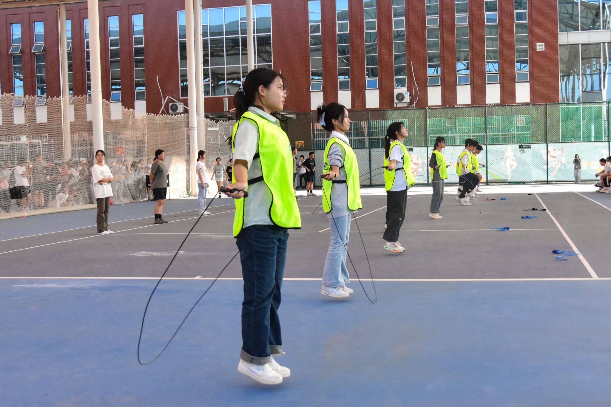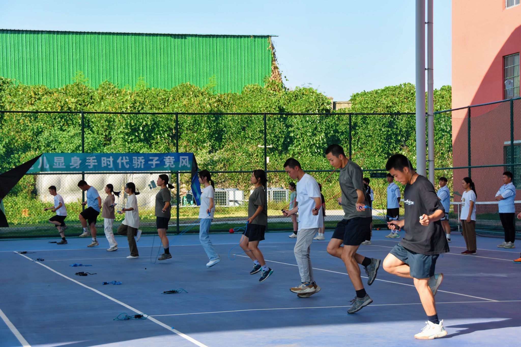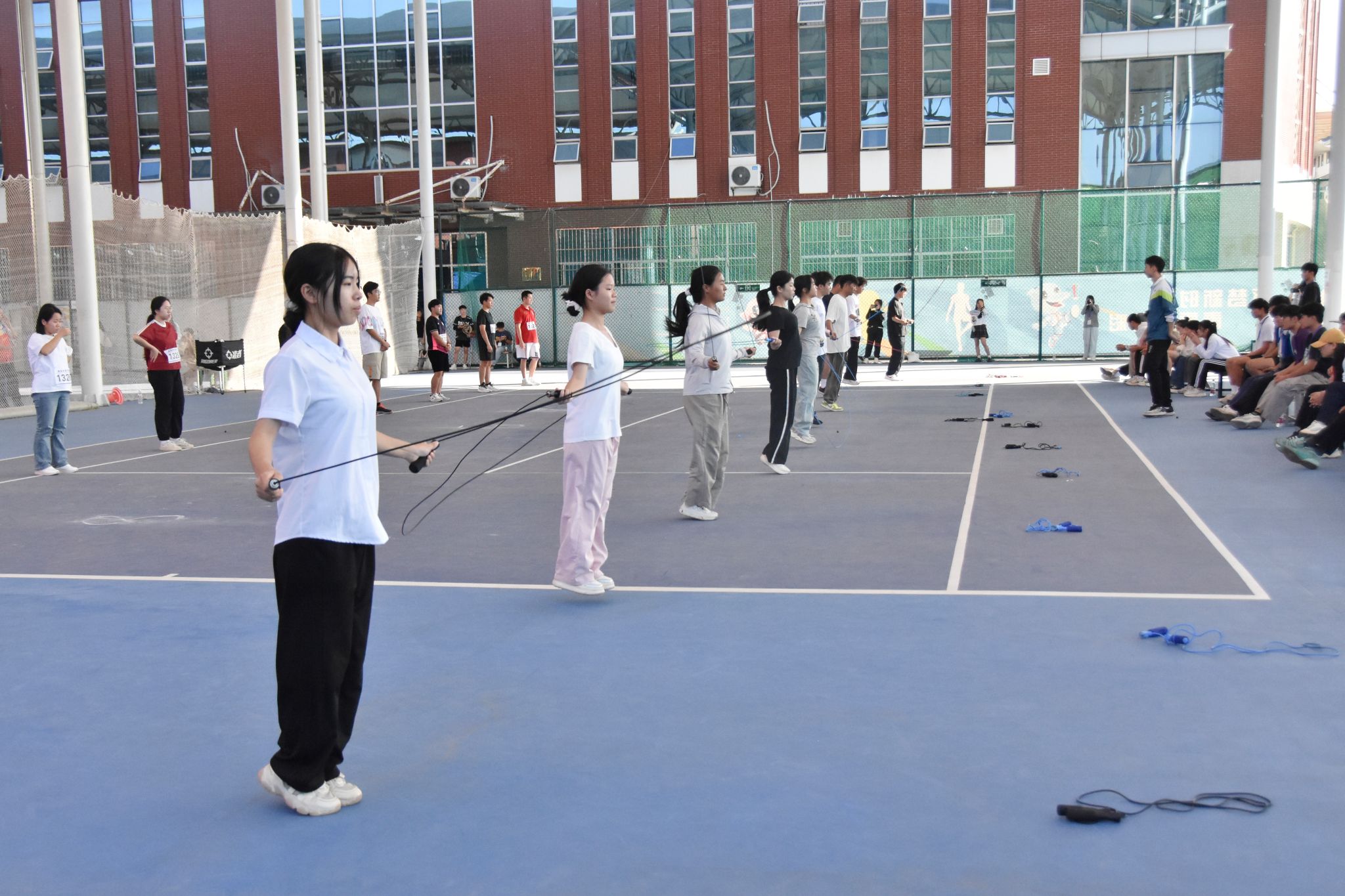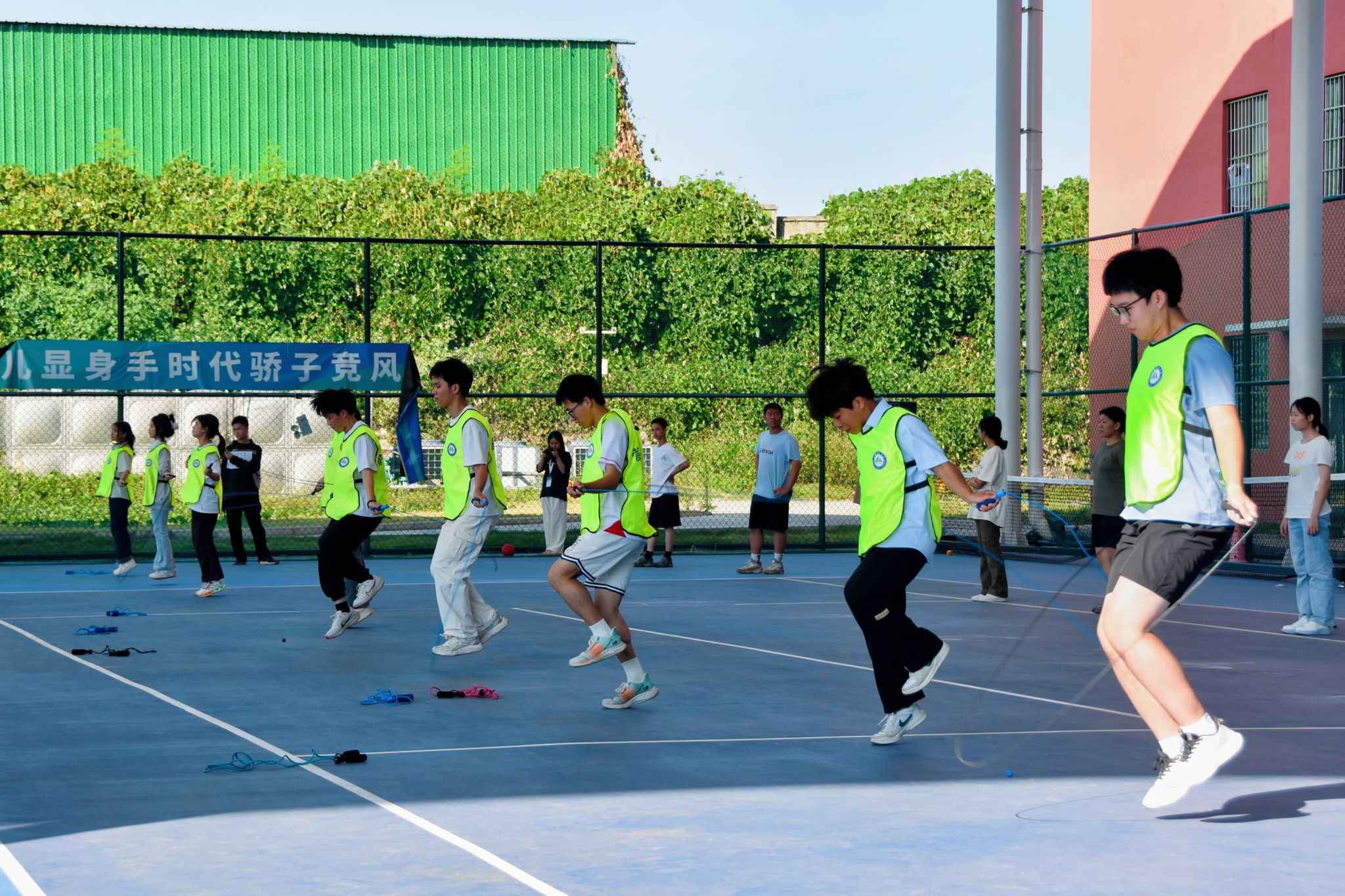各学院参赛队伍10人一组,每组限时1分钟持短绳参赛,成绩计算方法为10名队员的跳绳个数相加。