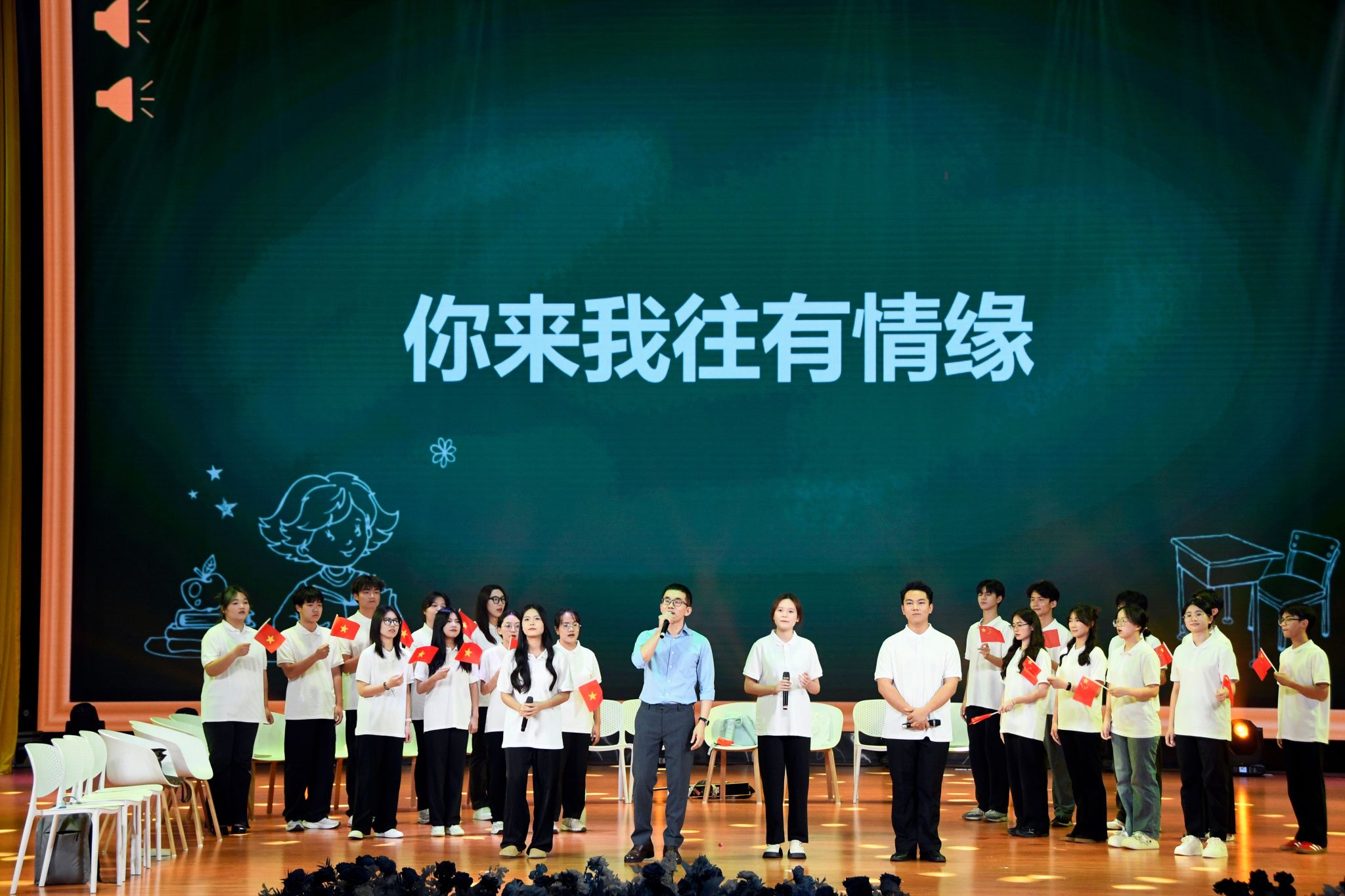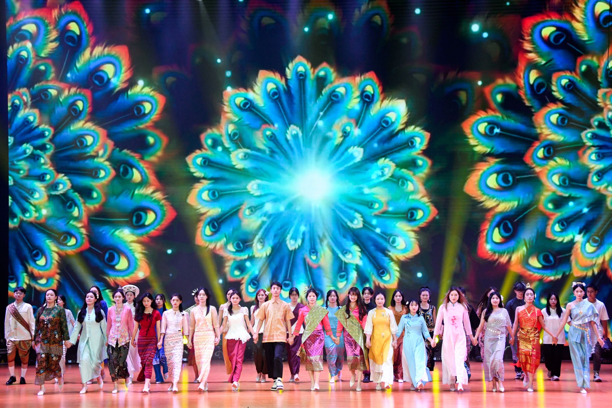 庆典在艺术学院/民歌学院“那蓝布壮”室内乐团带来的重奏曲《匏骨·情》中拉开帷幕,和谐悦耳的音乐融合了壮族与京族的民族乐器,展现广西人民对热土的深情与厚爱。老挝留学生的歌曲《老挝真美丽》和越南留学生的舞蹈Cây đa quán dốc 带领观众领略老挝山水、越南风情。梁远老师、李雅婧老师的《红梅赞》表达对房英、陶红、曾瑞莲等资深教授的崇高敬意。东南亚特色服装走秀、留学生的歌曲串烧、校友歌曲舞蹈,以及舞台剧等节目使现场掌声雷动,观众的回应将气氛推向高潮。
