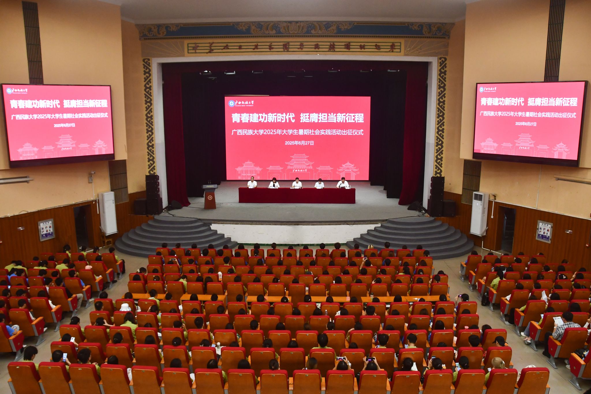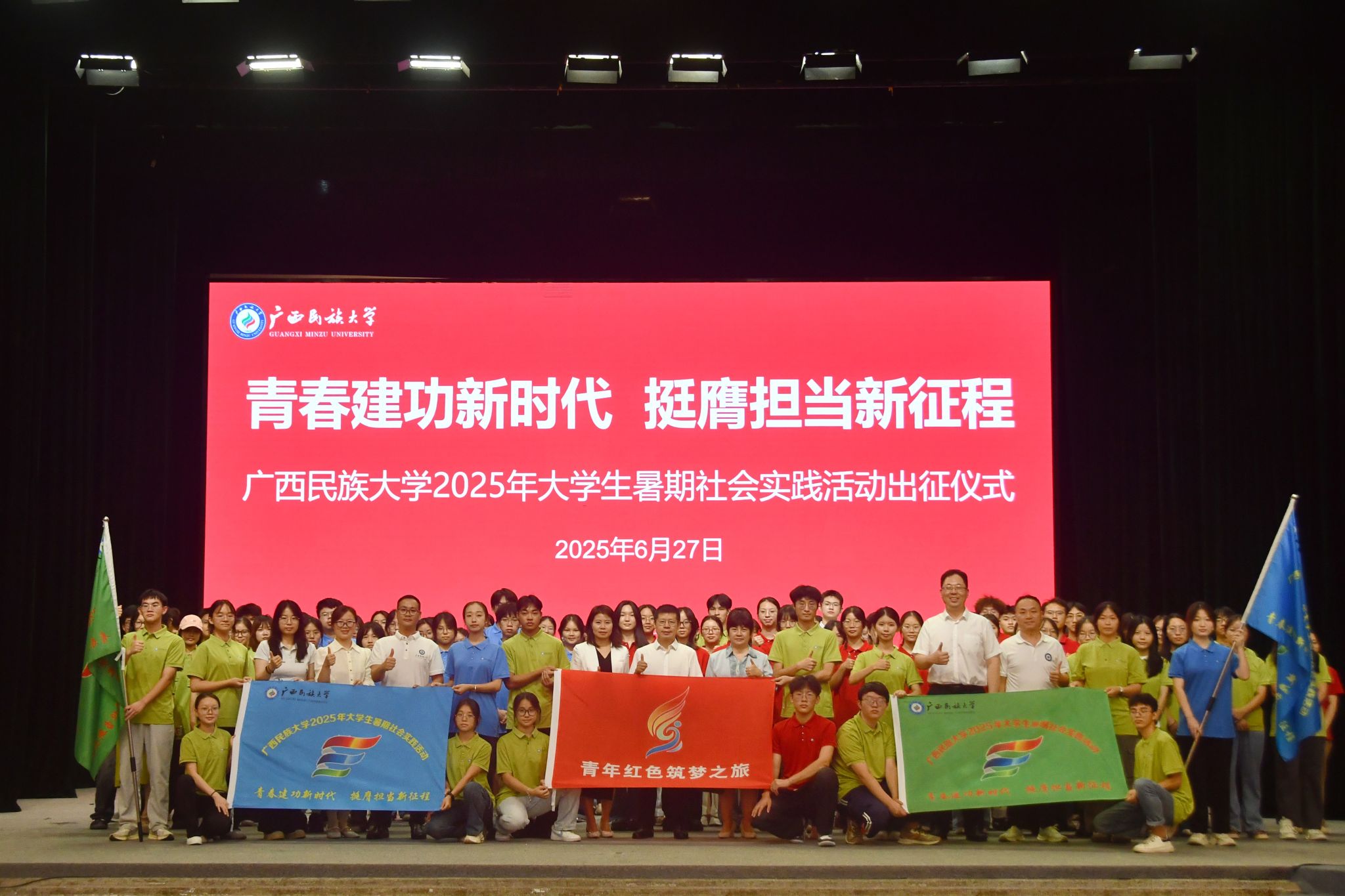 【大学生通讯社报道】6月27日下午,广西民族大学2025年大学生暑期社会实践活动出征仪式在相思湖校区礼堂举行。校党委副书记邓国彬出席仪式。学生工作部(处)、招生就业处、校团委、创新创业学院等负责人及各类项目立项团队成员参加仪式。校团委书记梁罡主持出征仪式。