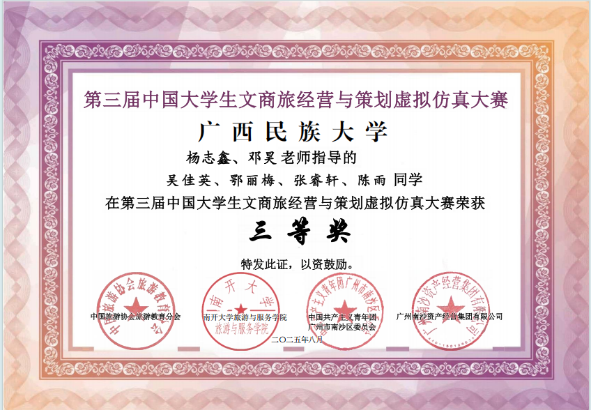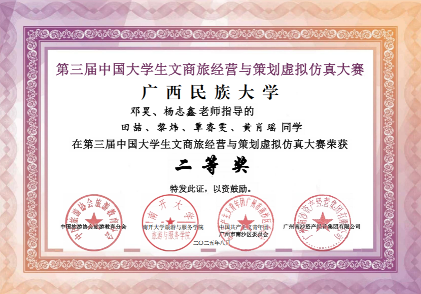 近日,第三届中国大学生文商旅经营与策划虚拟仿真大赛全国总决赛在广州南沙举行。广西民族大学管理学院学子组成的两支队伍表现优异,斩获全国二等奖1项(排名全国第21)、三等奖1项、实践特等奖1项。在同期举办的“青春图南 南沙好young”南沙全域游旅游转场大赛中,两支队伍再获2项优胜奖,邓昊和杨志鑫两位教师获评“优秀指导教师”。