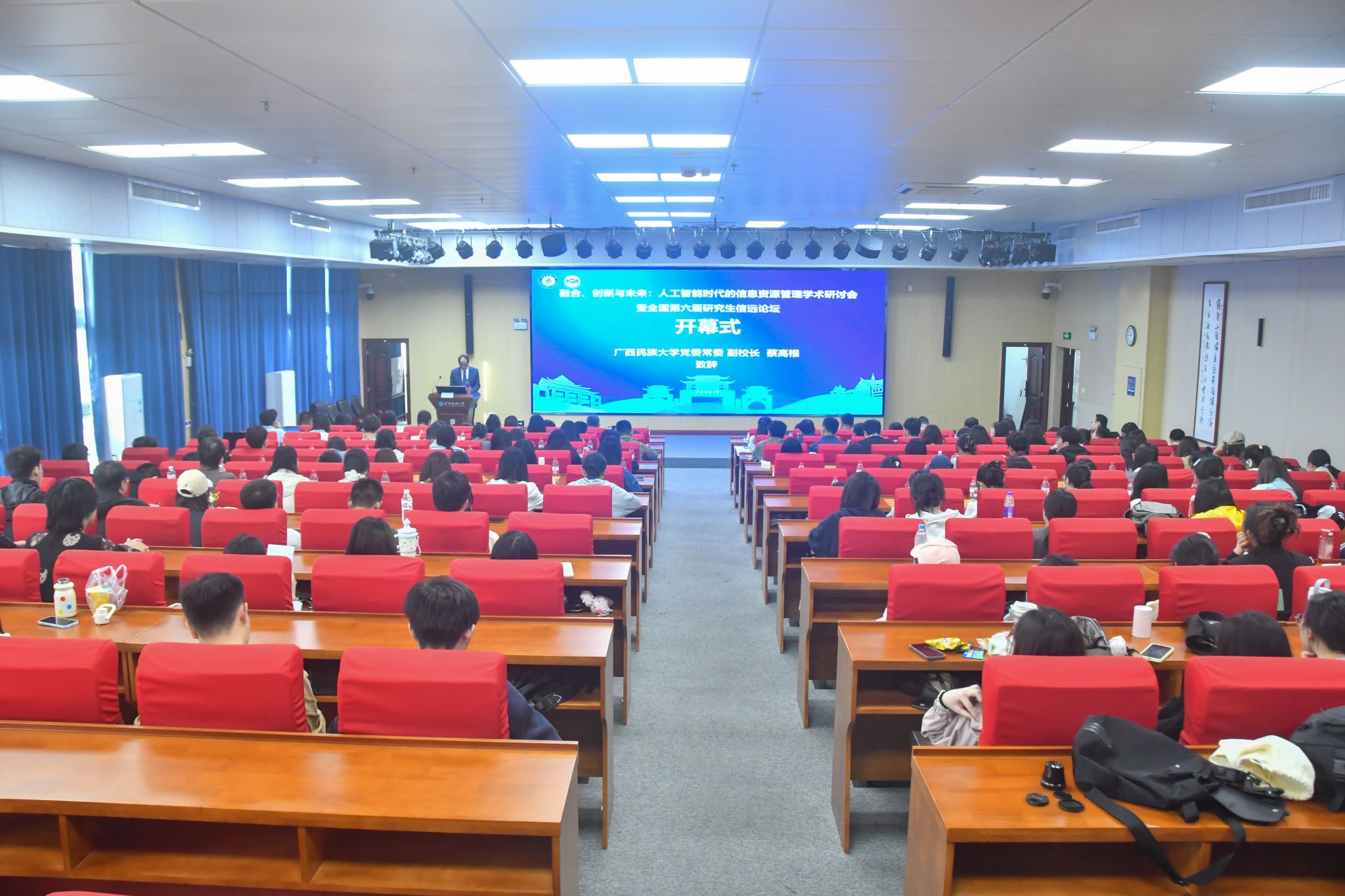 【大学生通讯社报道】10月25日上午,“融合、创新与未来:人工智能时代的信息资源管理学术研讨会”暨“全国第六届研究生信远论坛”在广西民族大学相思湖校区图书馆1301会议室举行。学校党委常委、副校长蔡高根,自治区图书馆馆长秦小燕出席开幕式。有关领域专家学者、学校管理学院领导及师生代表参加会议。