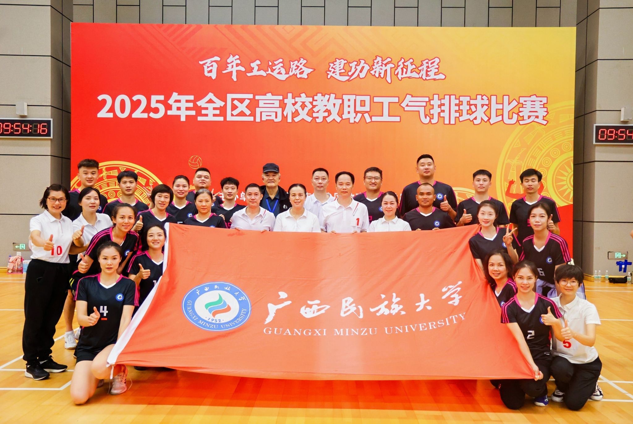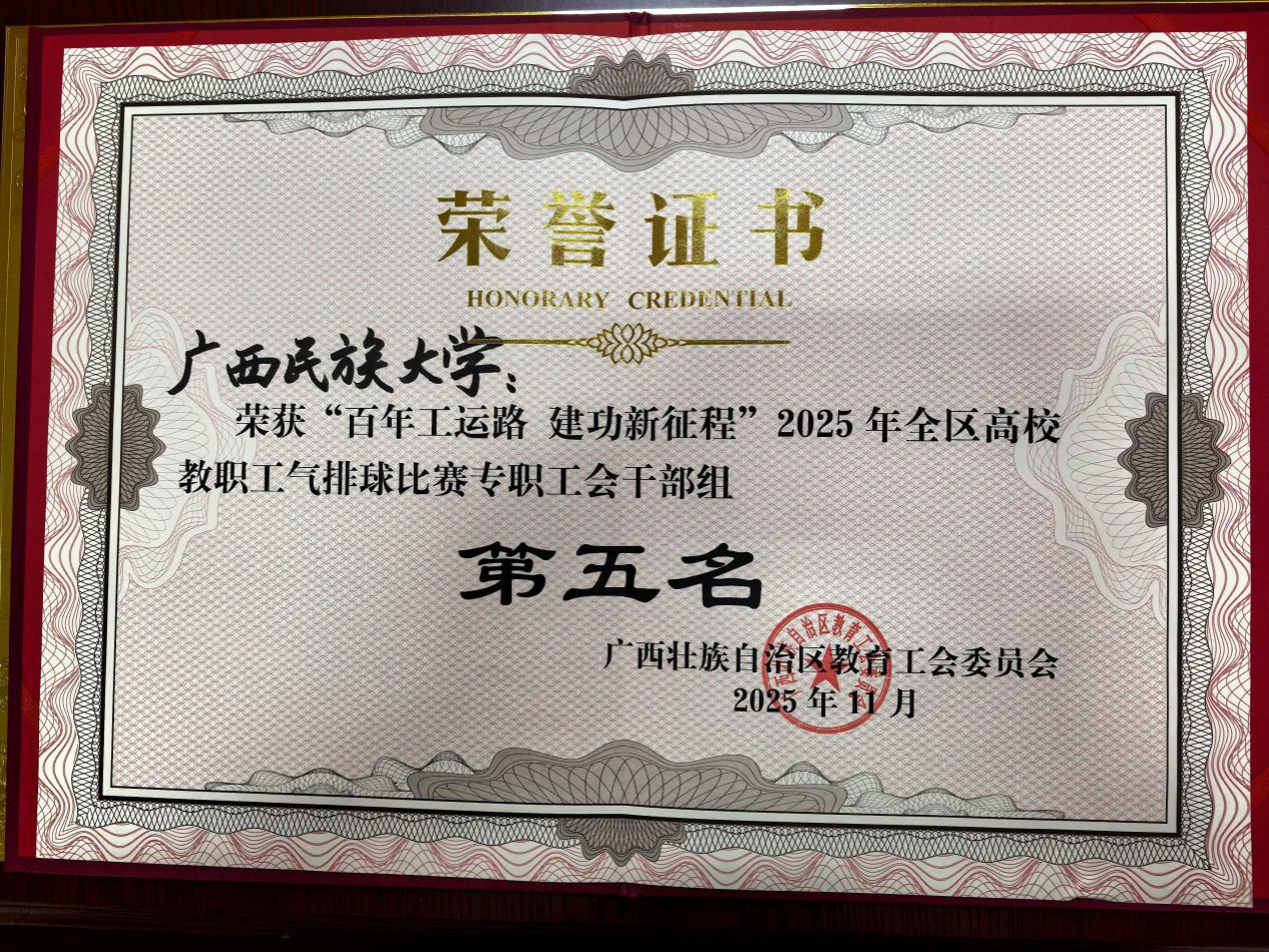 11月9日,“百年工运路 建功新征程”2025年全区高校教职工气排球比赛在广西体育中心圆满落幕。本次比赛共有来自全区52所高校的48支男队、47支女队、18支工会专职干部队,约1100名教职工参加比赛。广西民族大学教职工在本次比赛上表现出色,获得女子组冠军和专职工会干部组第五名的佳绩。