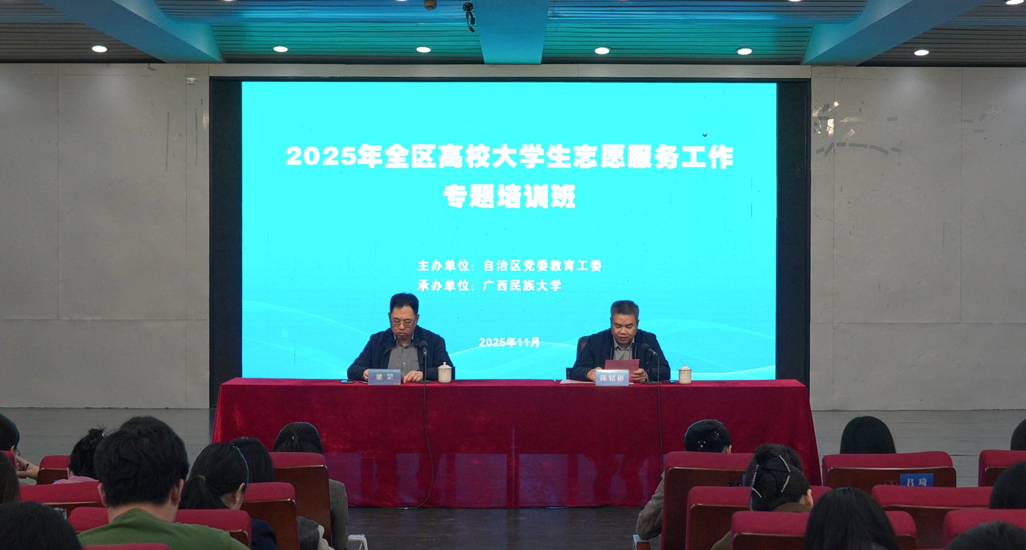 11月5日至7日,2025年全区高校大学生志愿服务工作专题培训班在广西民族大学大学生活动中心举行。广西民族大学党委副书记陈铭彬出席开班仪式并致辞。全区85所高校的共青团干部参与了本次培训班学习。