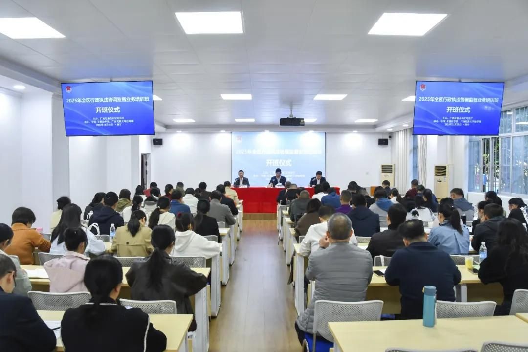 【大学生通讯社报道】11月25日,广西民族大学在相思湖校区逸夫楼101室举办全区行政执法协调监督业务培训班开班仪式。自治区司法厅党委委员、副厅长梁和民,学校党委副书记邓国彬出席开班仪式。