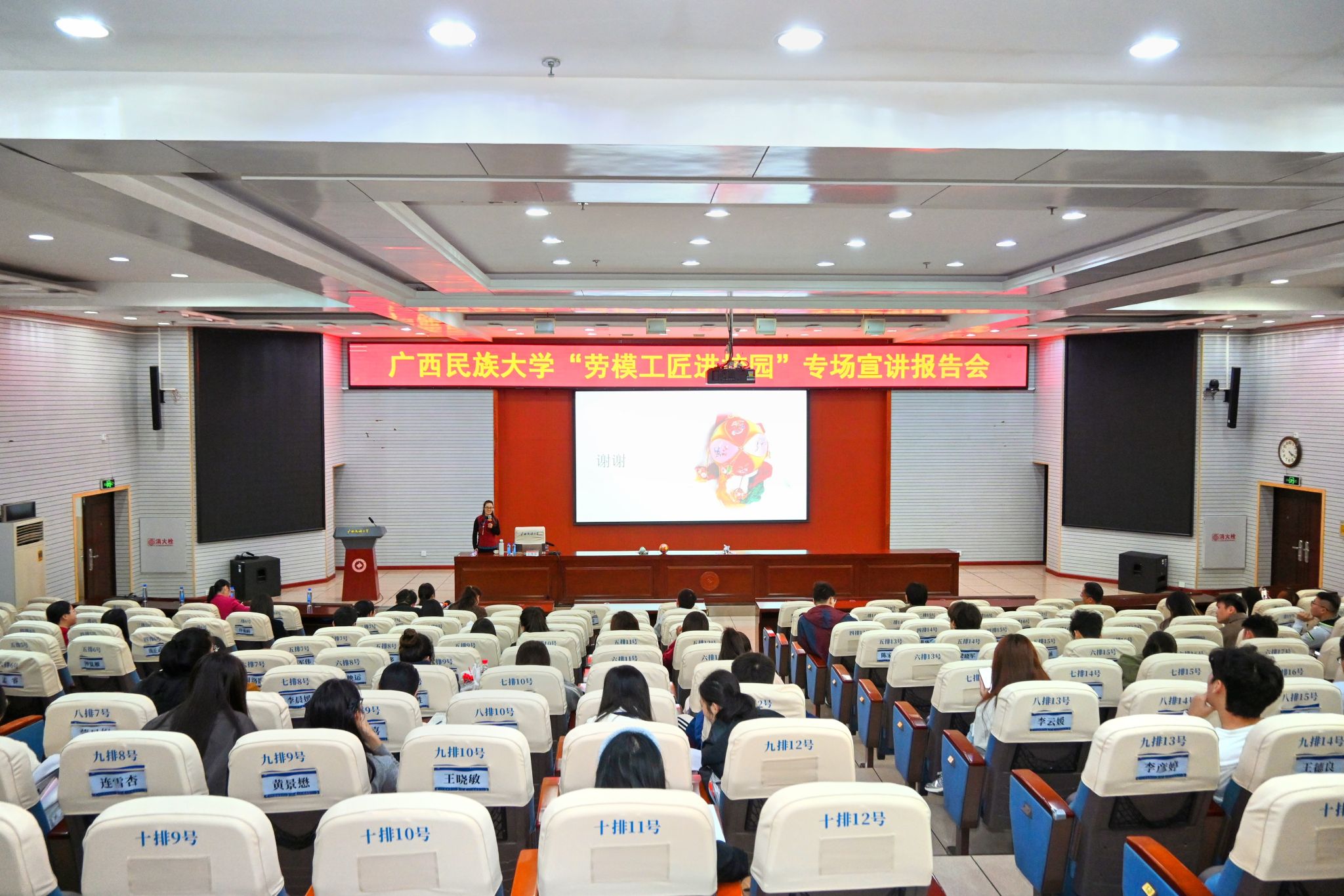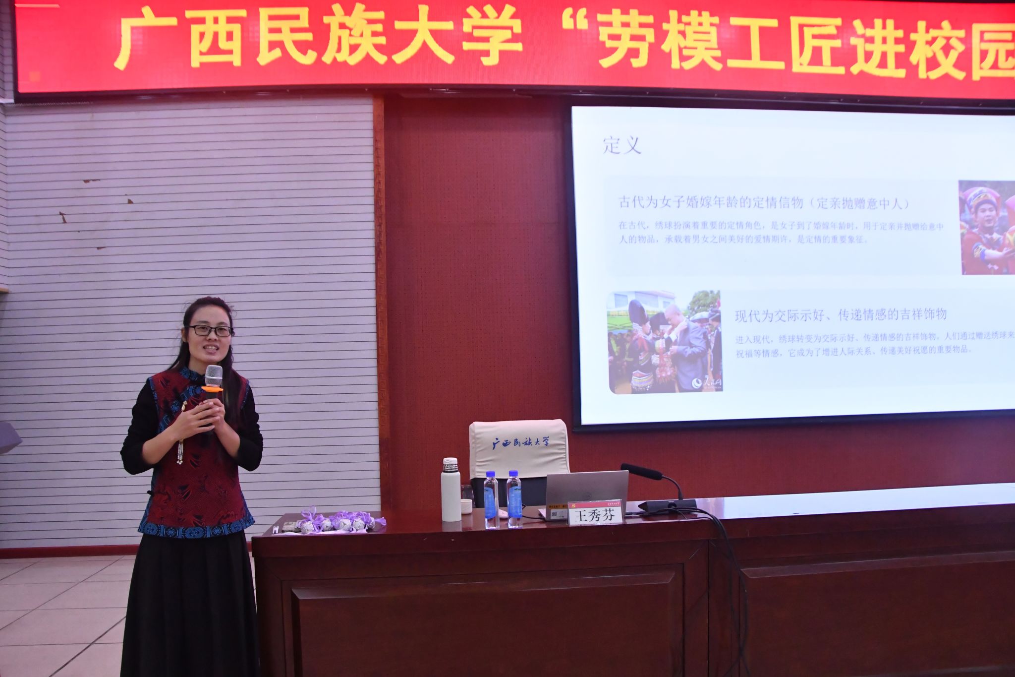 【大学生通讯社报道】11月26日下午,广西民族大学在相思湖校区科技楼报告厅举办“劳模工匠进校园”专场宣讲报告会。靖西市绣蕴坊绣球文化有限公司总工艺师、全国五一劳动奖章获得者、全国三八红旗手、广西工匠王秀芬作主题宣讲。学校各分工会、工会小组会员代表以及各学院学生代表现场聆听。