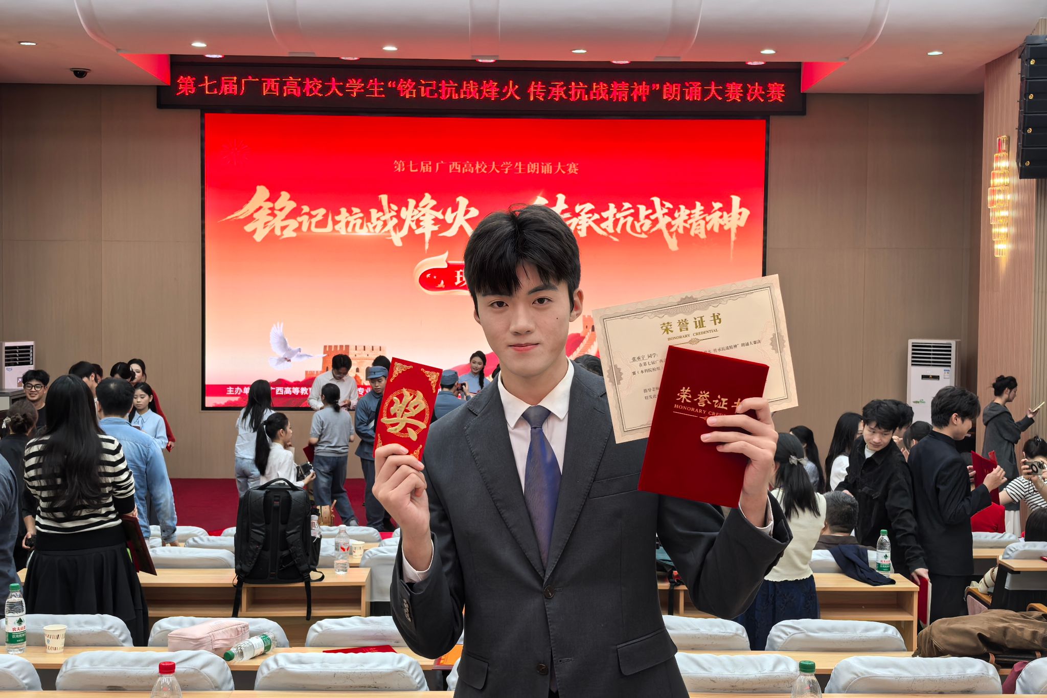 近日,第七届广西高校大学生“铭记抗战烽火 传承抗战精神”朗诵大赛圆满落幕。广西民族大学传媒学院2025级播音与主持艺术专业张承宇凭借作品《红铁》,从全区多所高校的参赛选手中脱颖而出,荣获比赛二等奖。